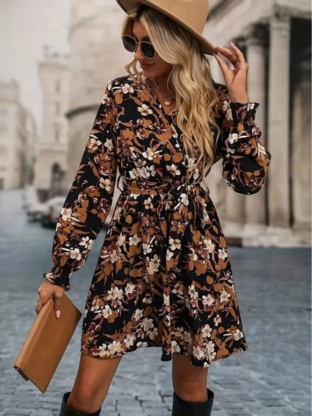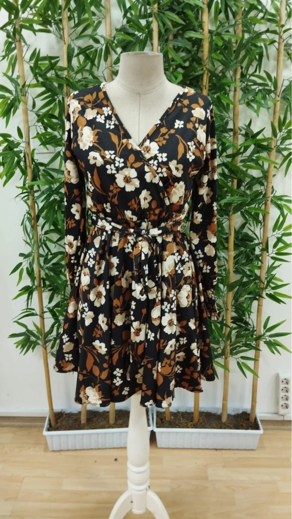 Kadın Uzun Kollu Kruvaze Yaka çiçek Desenli Dalgıç Elbise