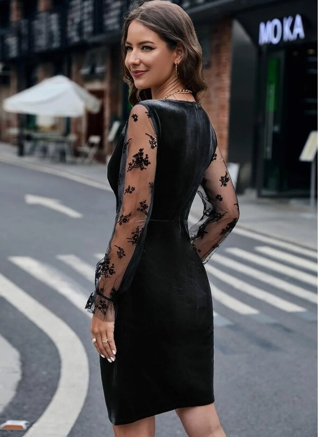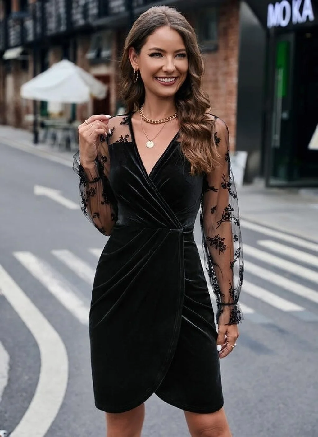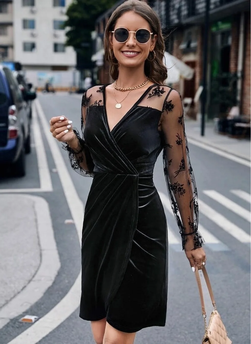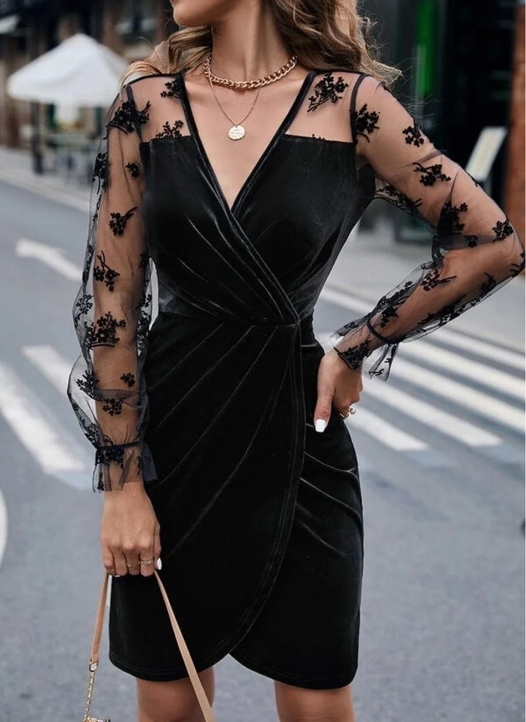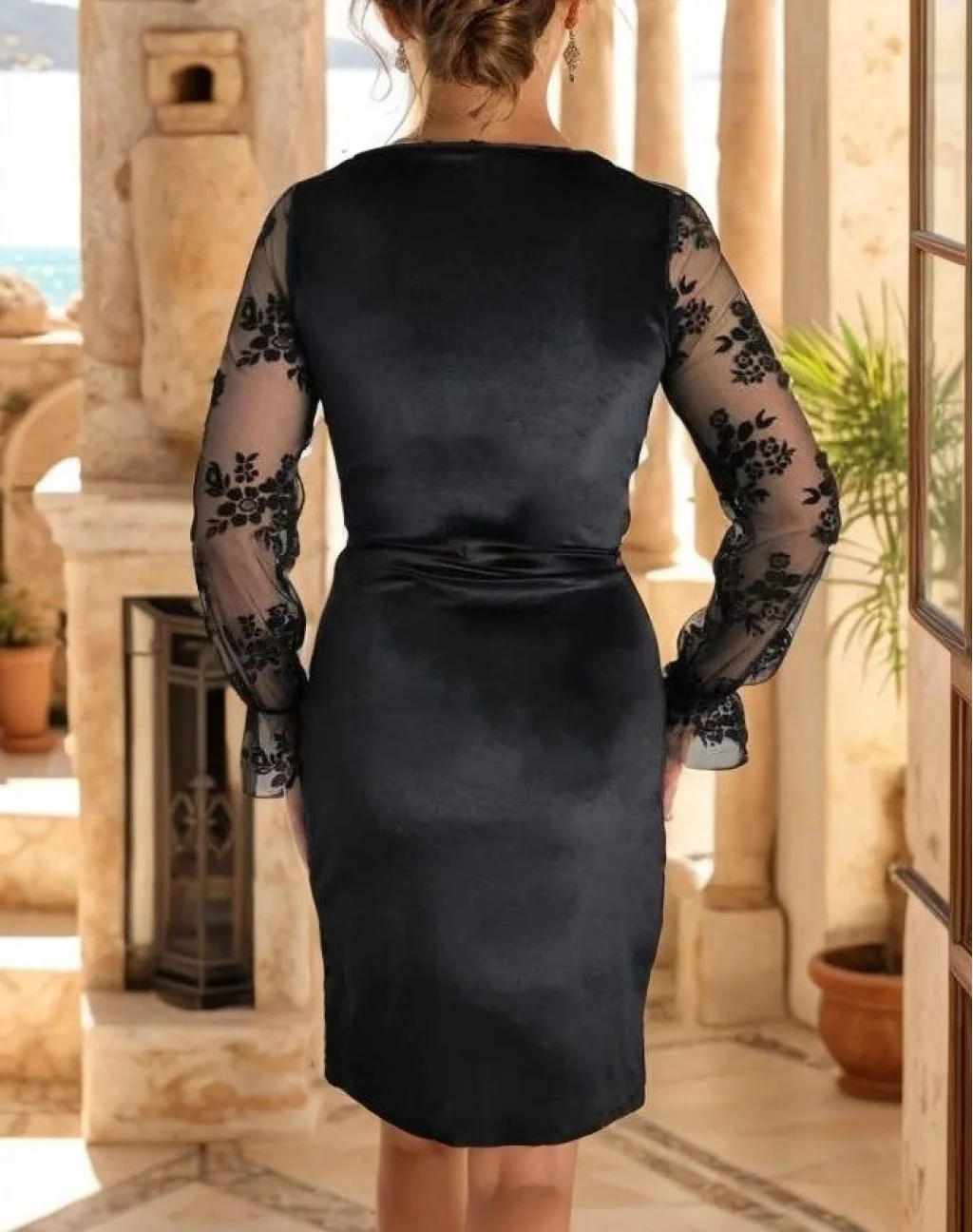 Kadın Uzun Kollu Kruvaze Yaka Kollar Tül Detay Beli Lastikli Kadife Mini Boy Elbise