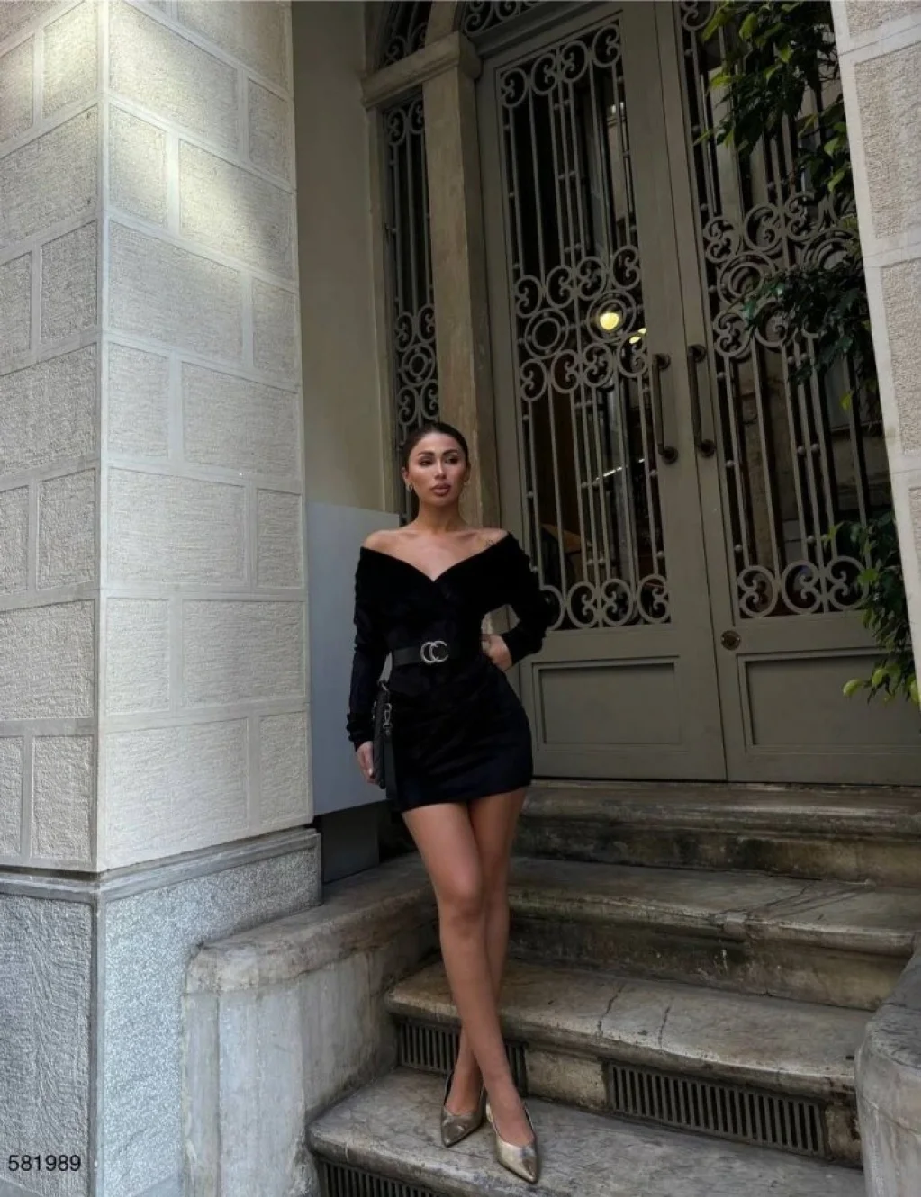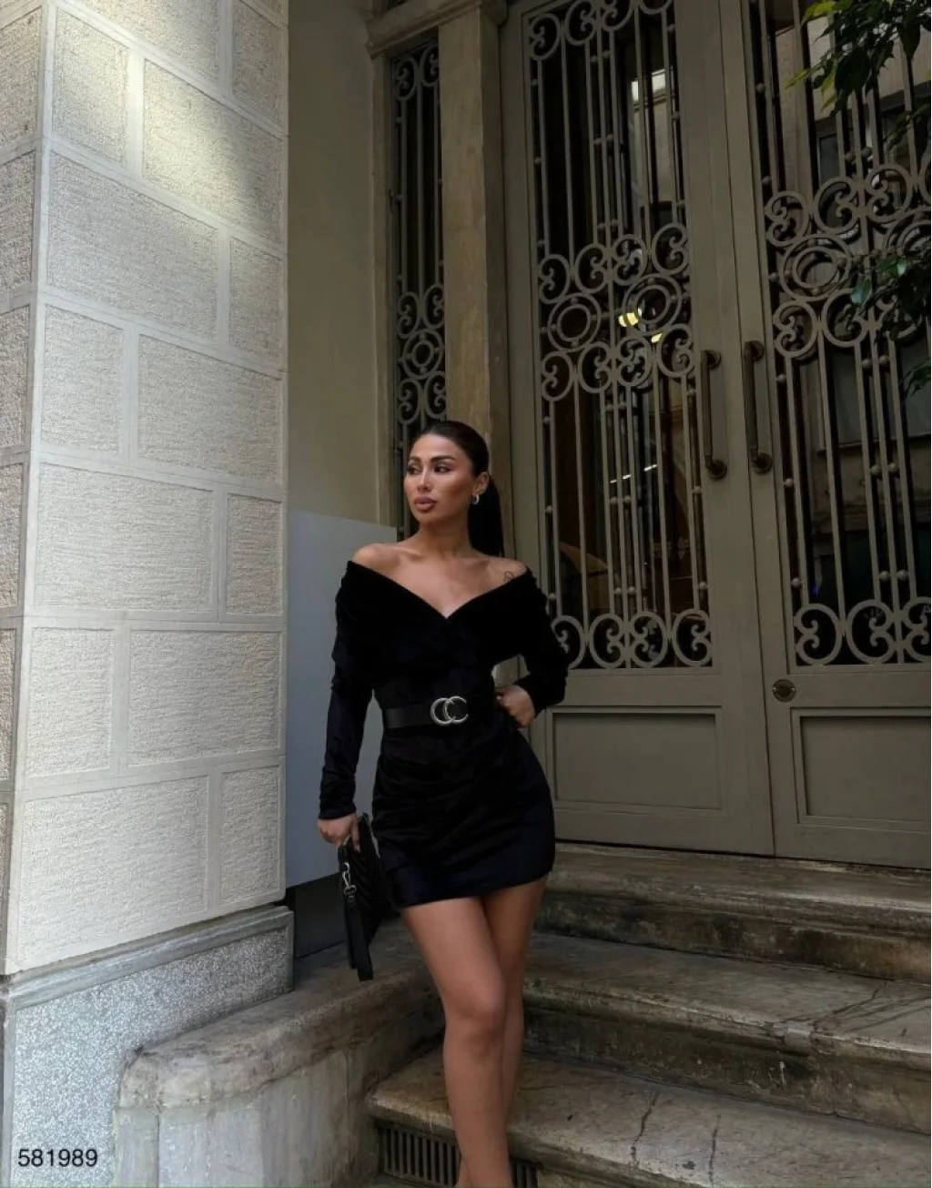 Kadın Uzun Kollu Kruvaze Yaka Omuz Dekolteli Kemer Dahil Mini Kadife Elbise