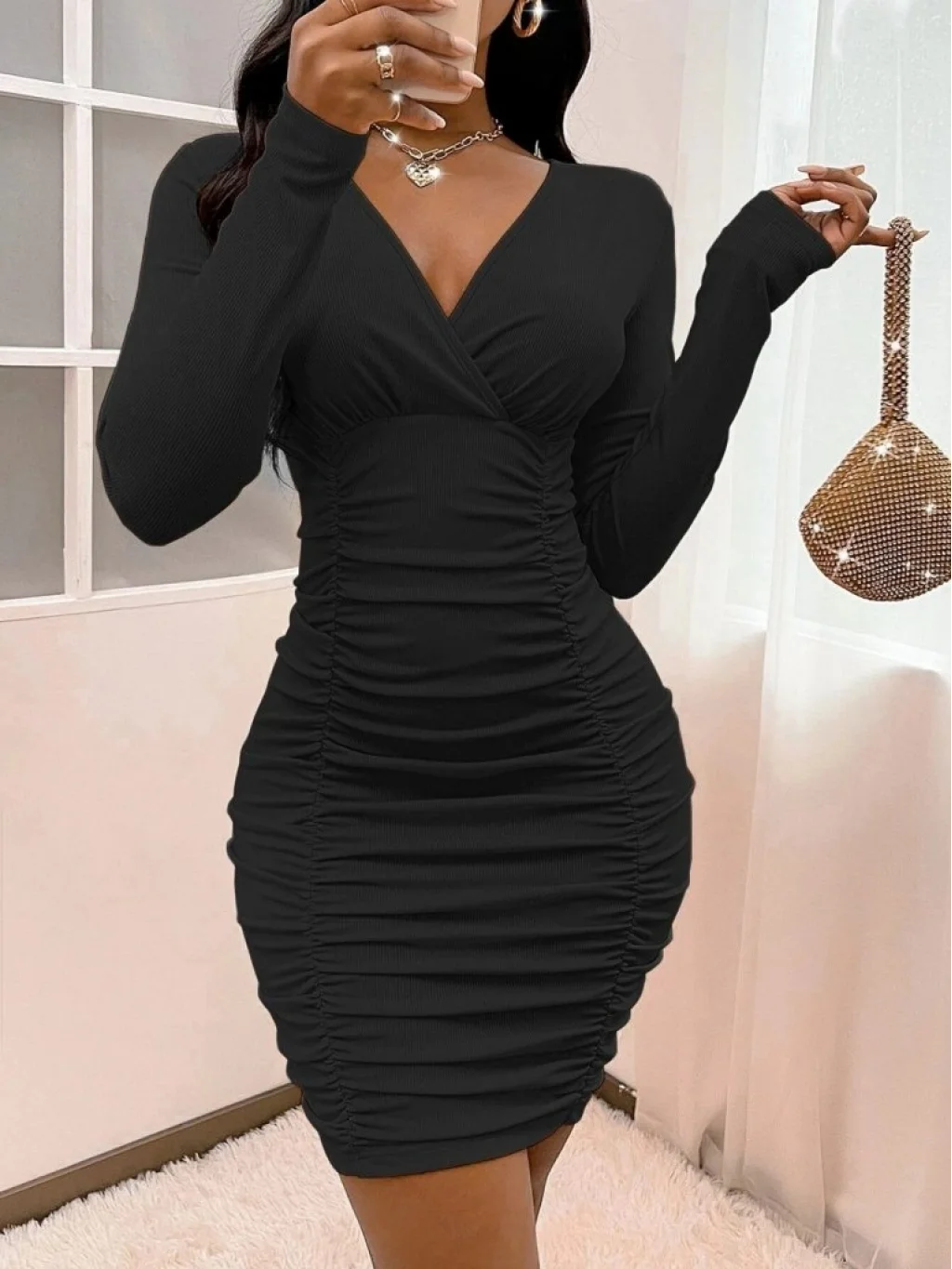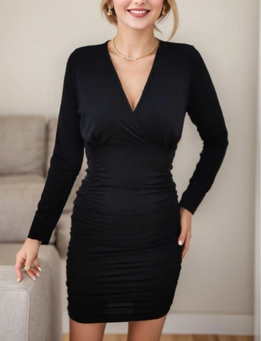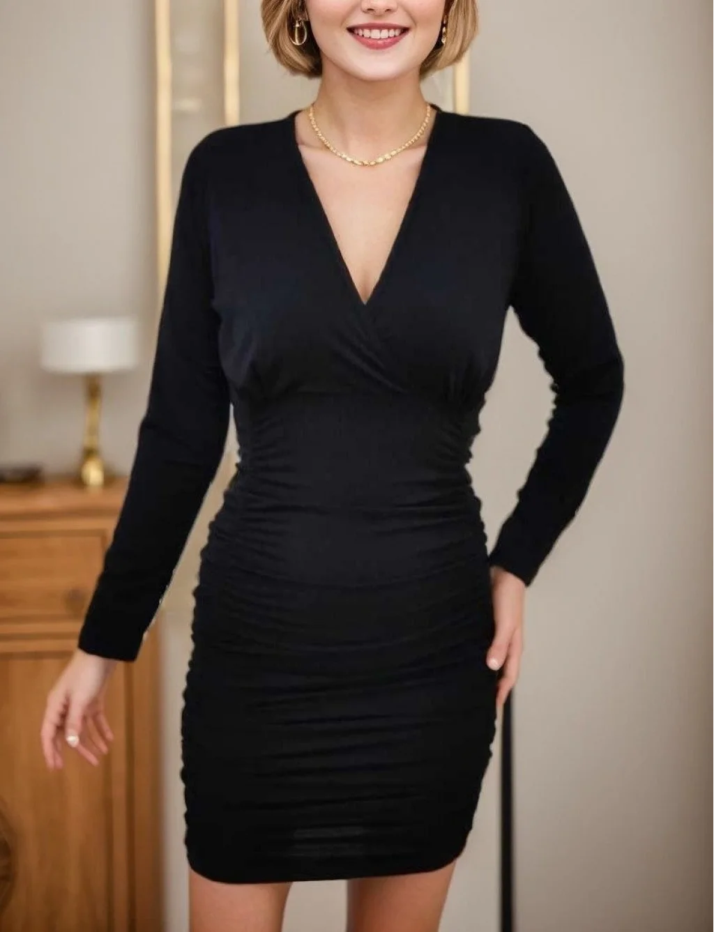Kadın Uzun Kollu Kruvaze Yaka Sandy Mini Elbise