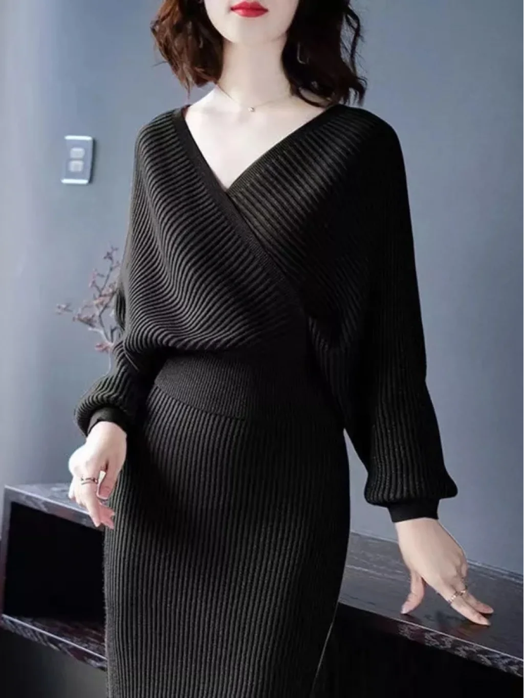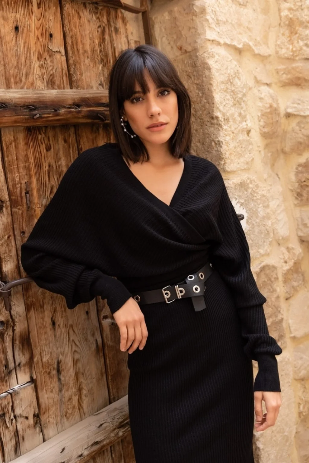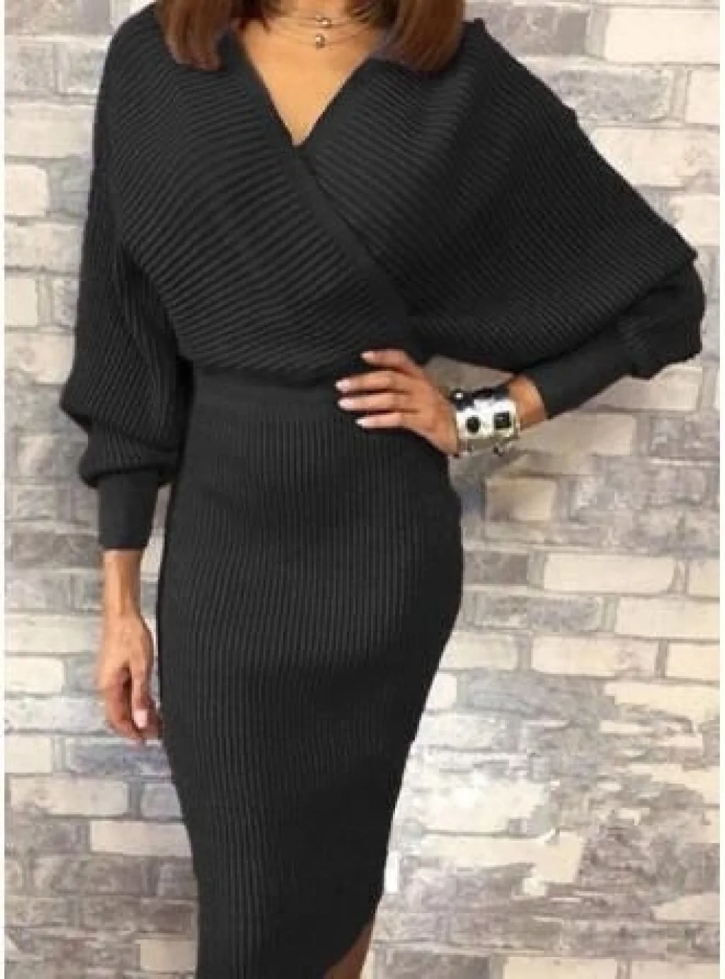 Kadın Uzun Kollu Kruvaze Yaka Triko Elbise