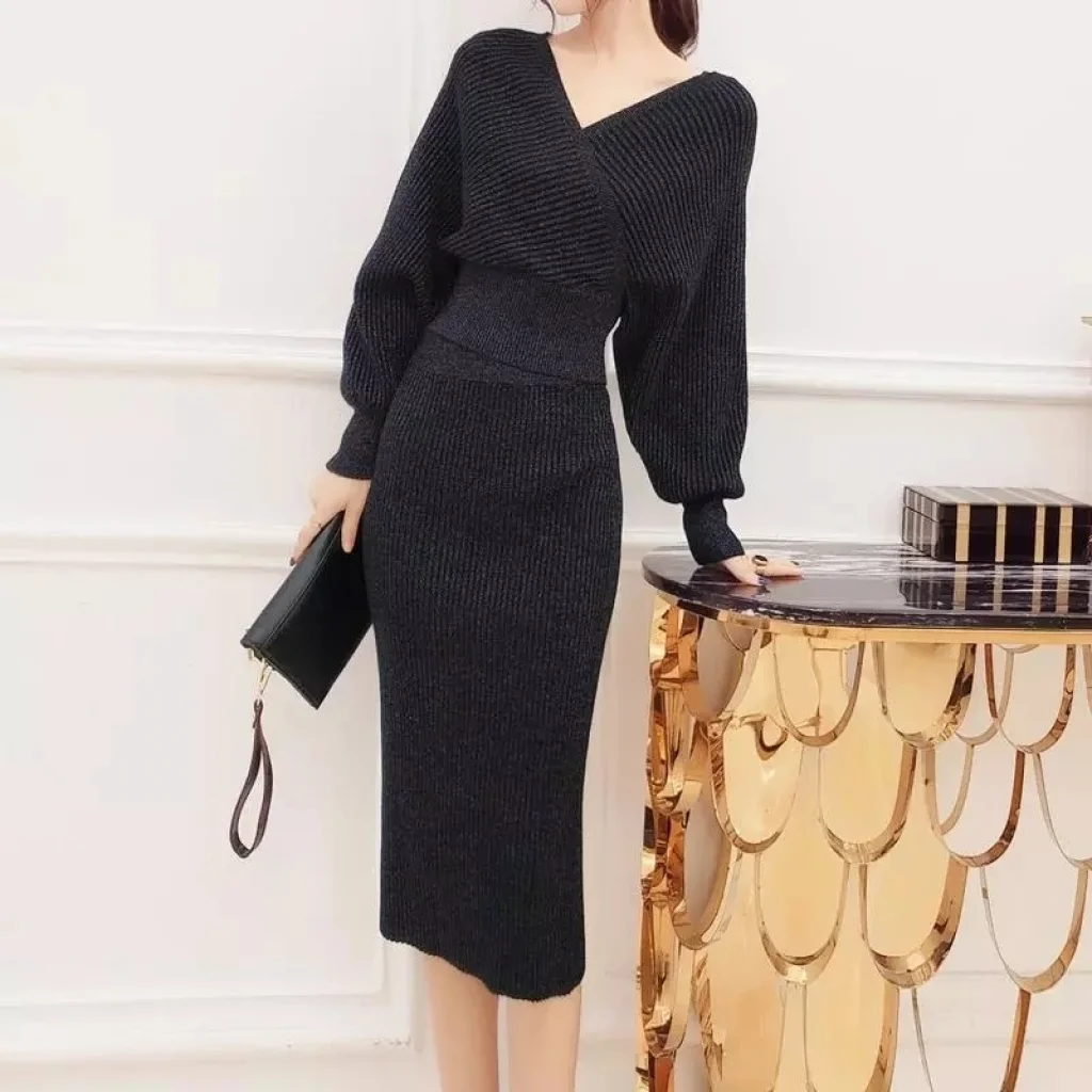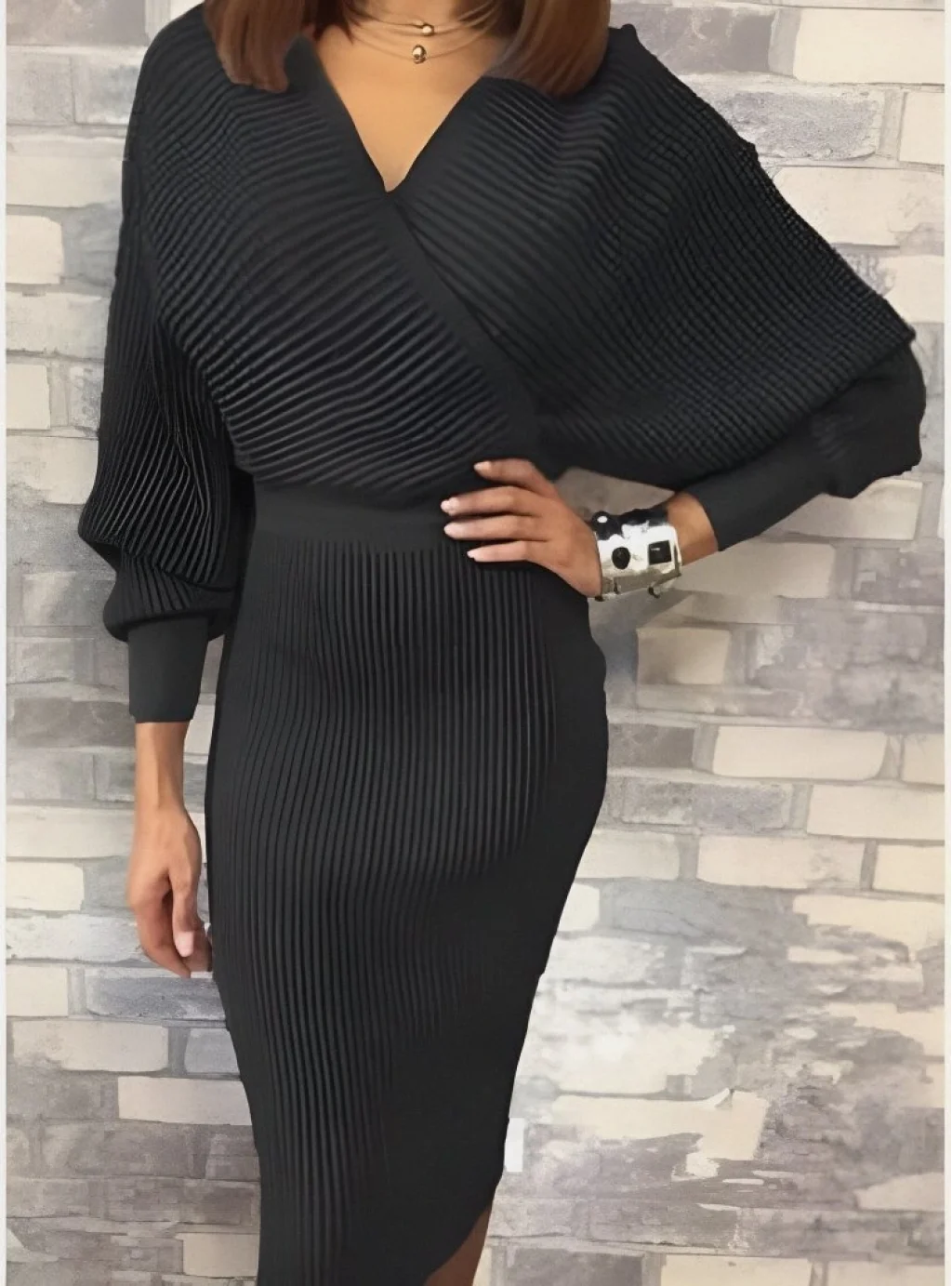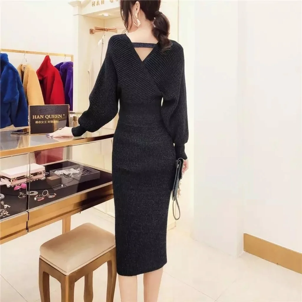 Kadın Uzun Kollu Kruvaze Yaka Triko Elbise