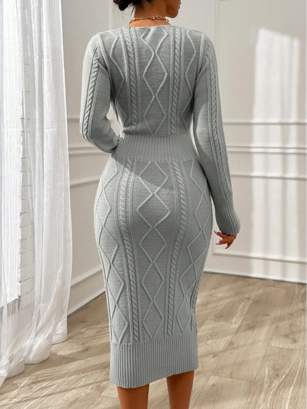 Kadın Uzun Kollu Kruvaze Yaka Triko Midi Boy Elbise
