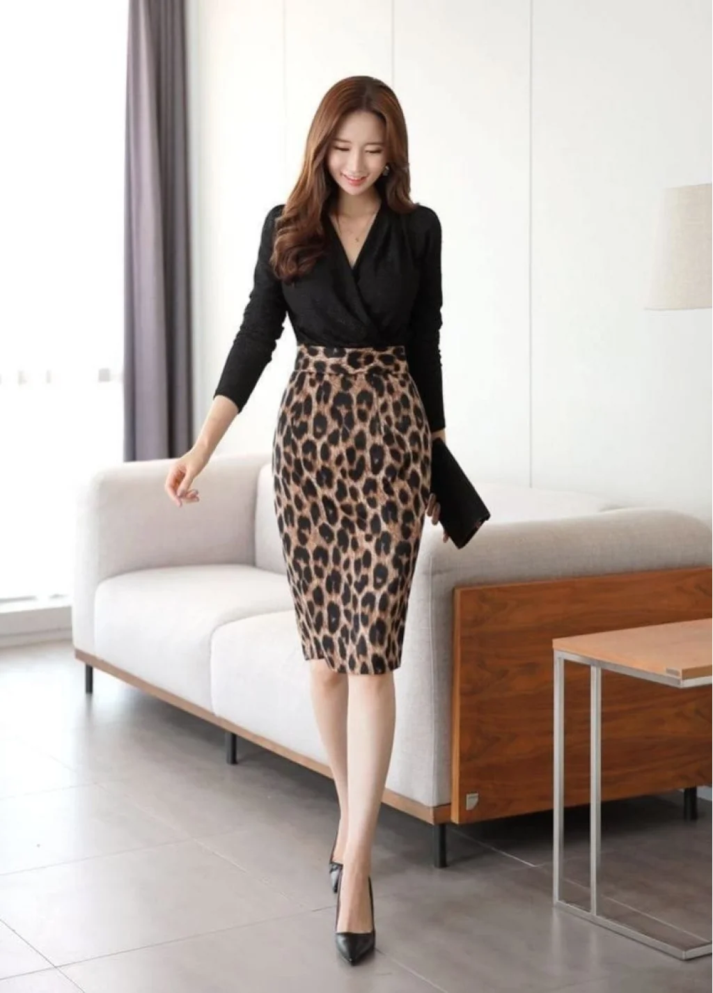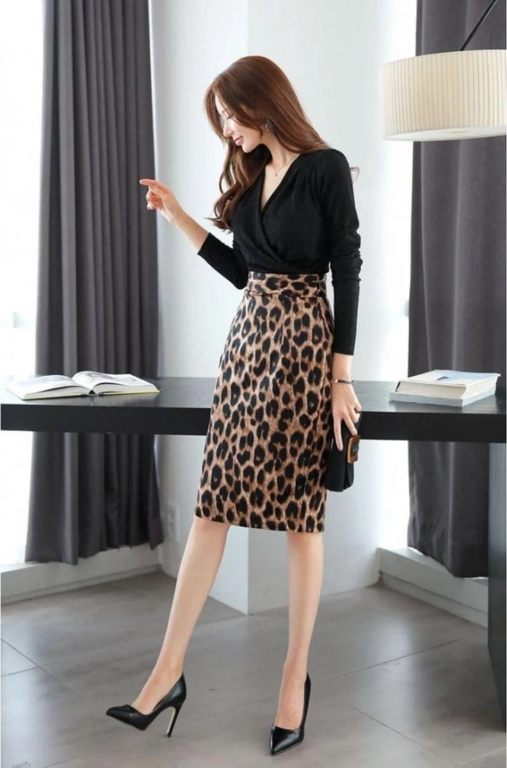 Kadın Uzun Kollu Kruvaze Yaka üst Ithal Krep Alt Dalgıç Leopar Detaylı Elbise