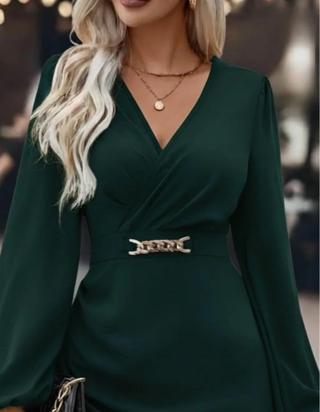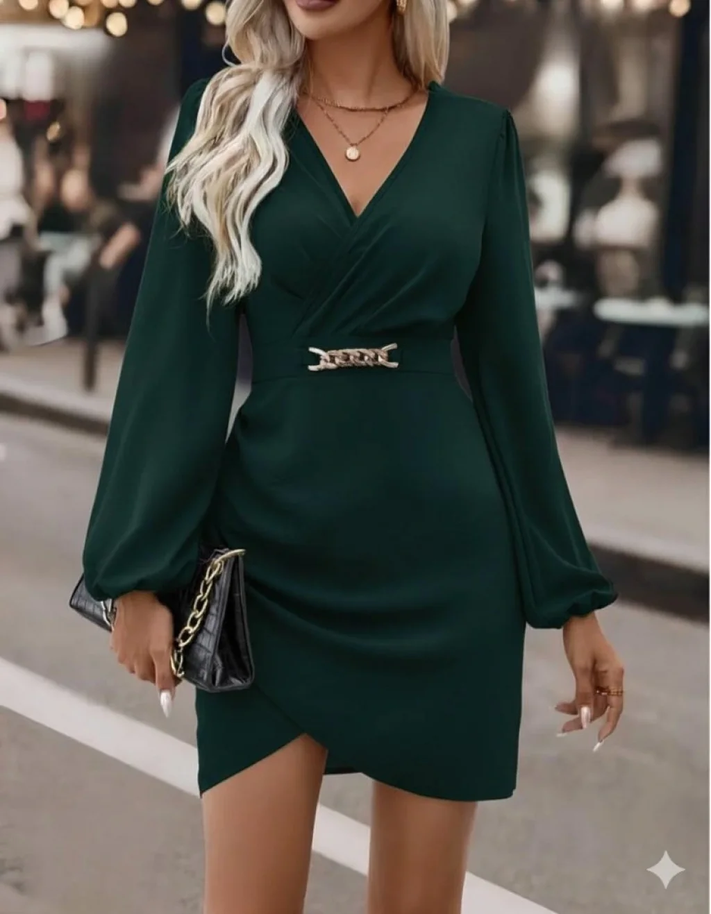 Kadın Uzun Kollu Kruvaze Yaka Yandan Büzgülü Asimetrik Detaylı Ithal Krep Mini Elbise