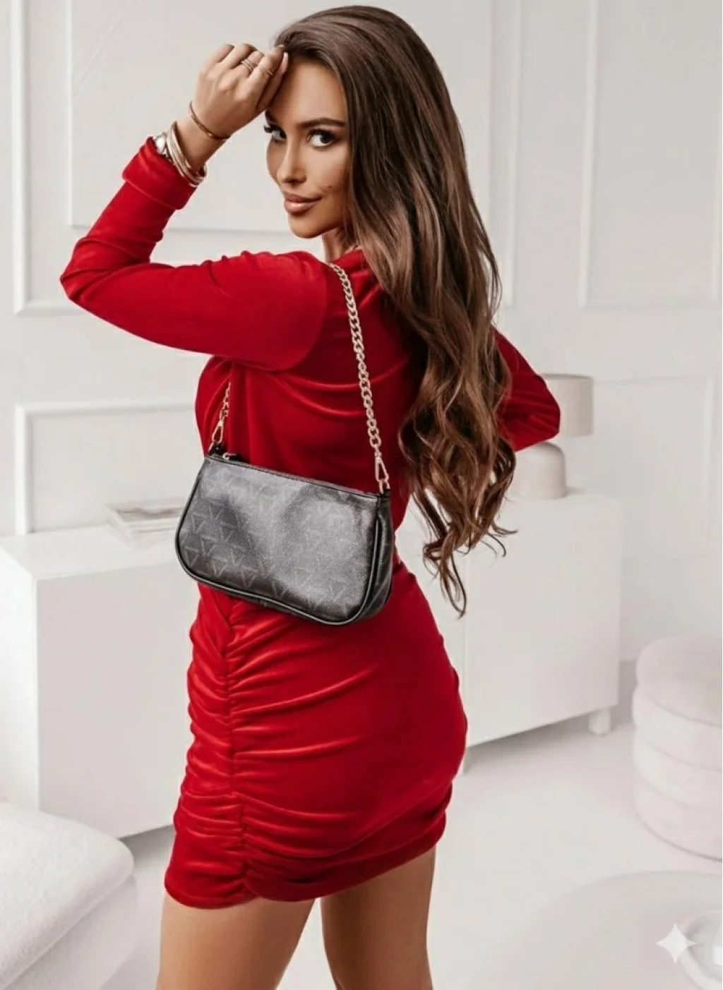Kadın Uzun Kollu Kruvaze Yaka Yandan Büzgülü Mini Ithal Krep Elbise