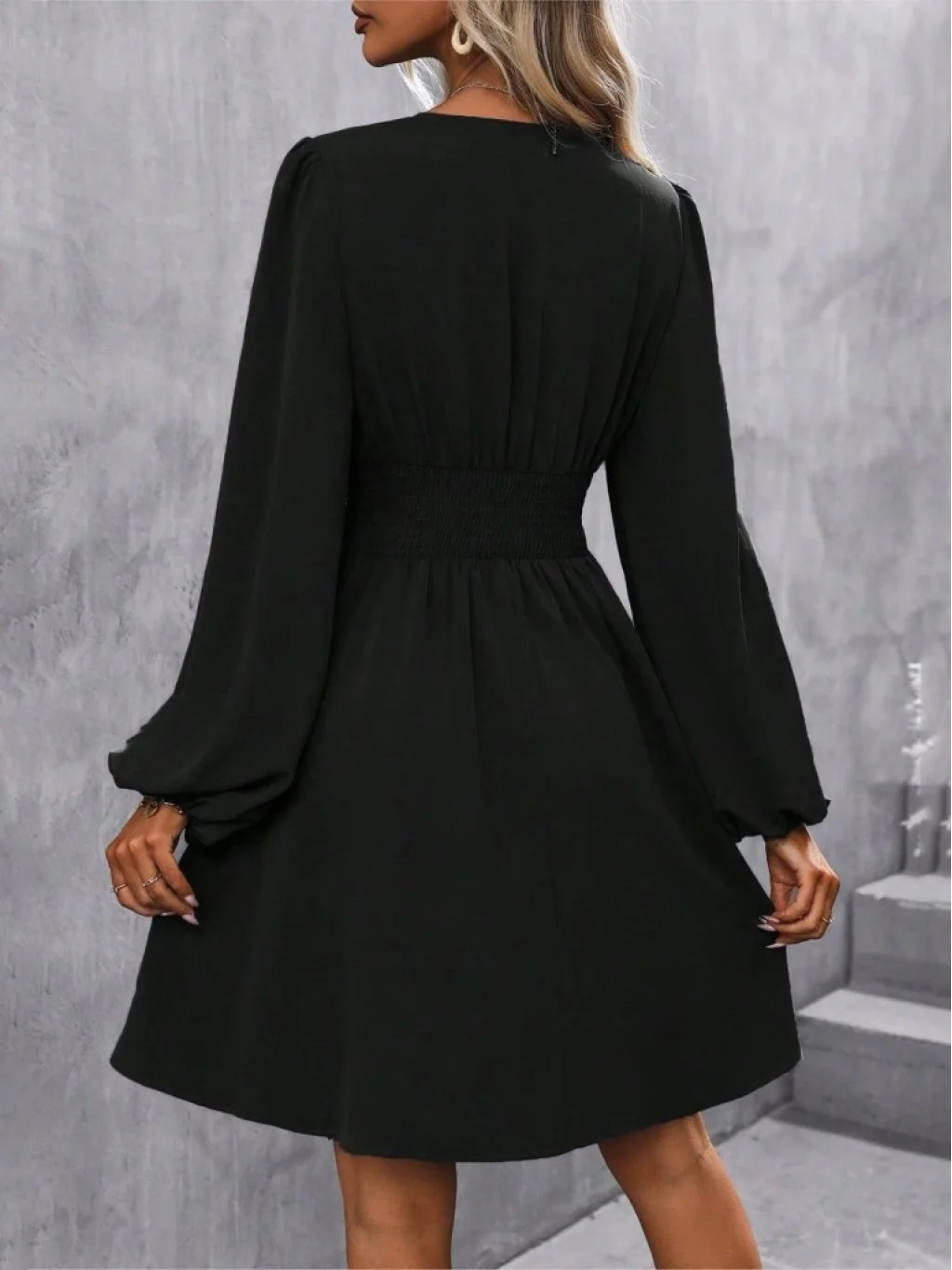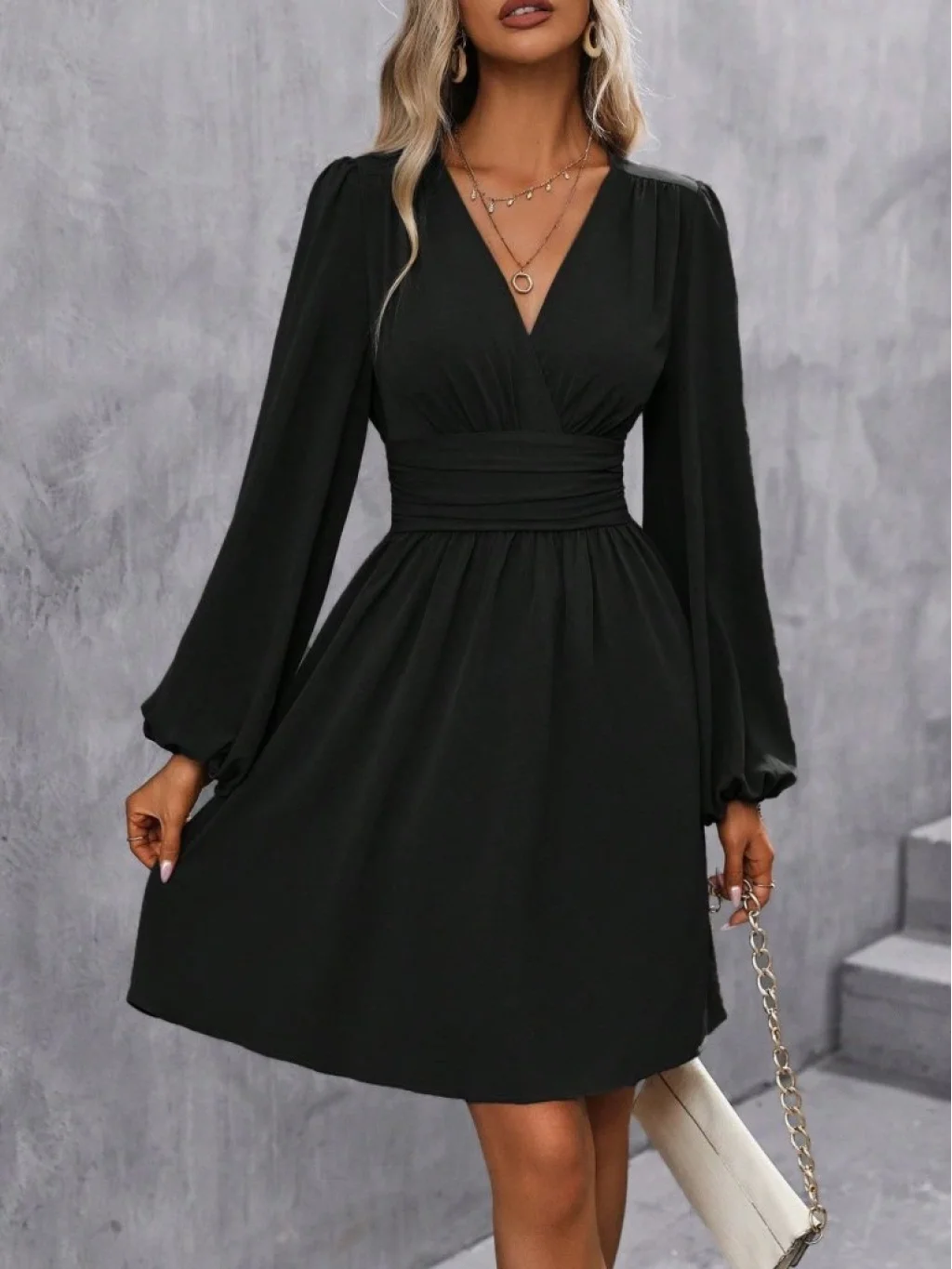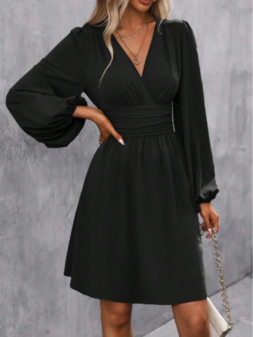 Kadın Uzun Kollu Kruvaze Yakalı Bel Korsajlı Mini Elbise