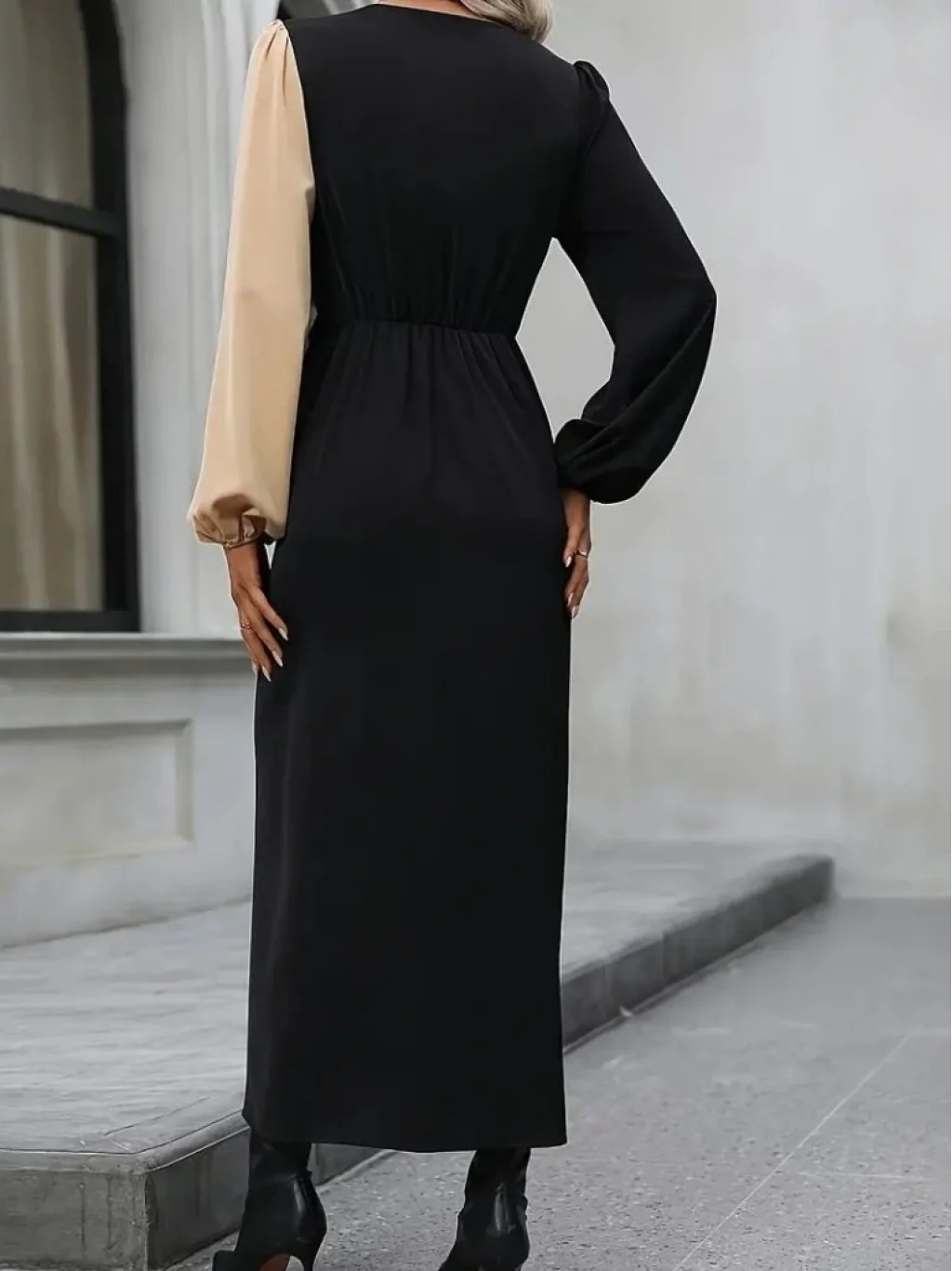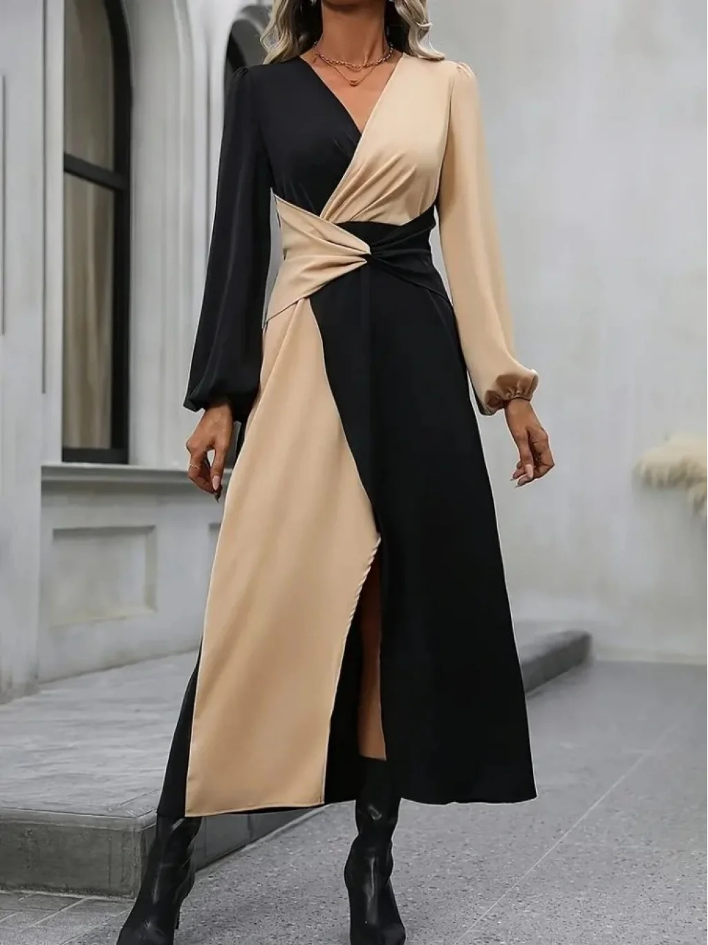 Kadın Uzun Kollu Kruvaze Yakalı Belden çapraz Detaylı çift Renkli Midi Ithal Krep Elbise