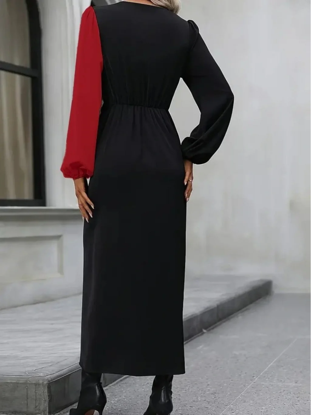 Kadın Uzun Kollu Kruvaze Yakalı Belden çapraz Detaylı çift Renkli Midi Ithal Krep Elbise