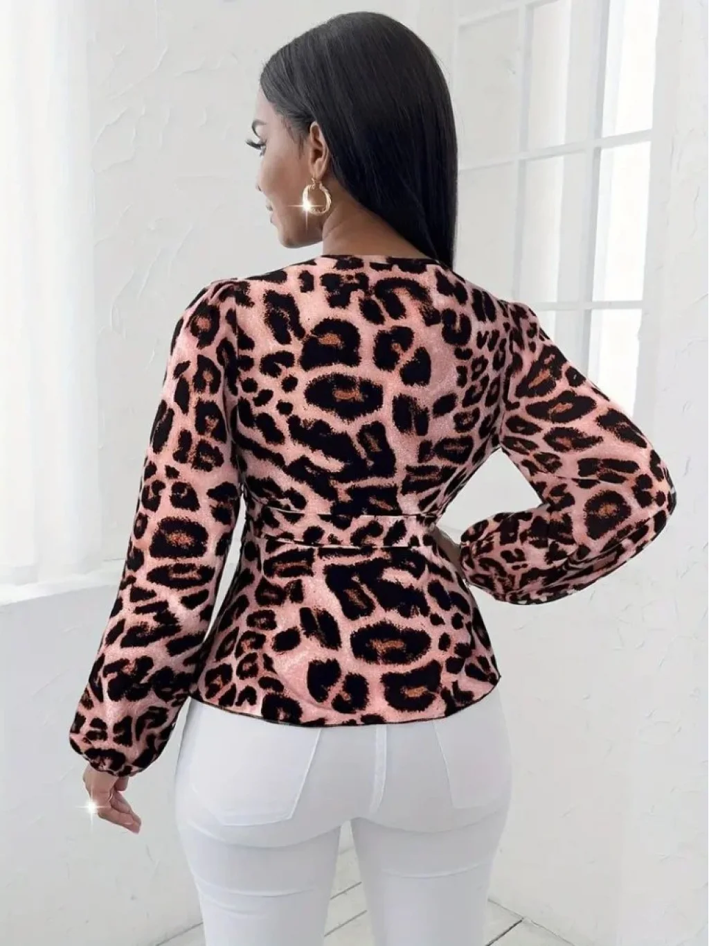 Kadın Uzun Kollu Kruvaze Yakalı Belden Kuşaklı Leopar Desenli Süprem Bluz