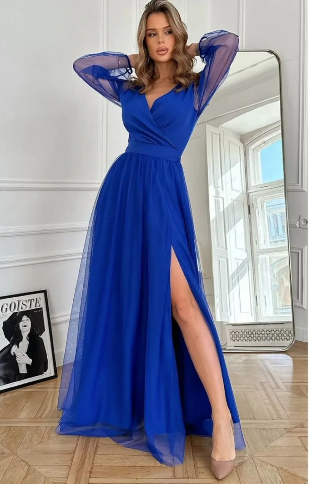 Kadın Uzun Kollu Kruvaze Yakalı Belden Kuşaklı Tüllü Uzun Ithal Krep Elbise