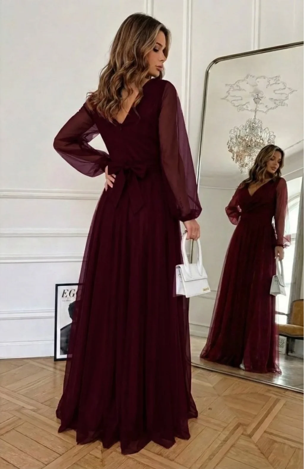 Kadın Uzun Kollu Kruvaze Yakalı Belden Kuşaklı Tüllü Uzun Ithal Krep Elbise