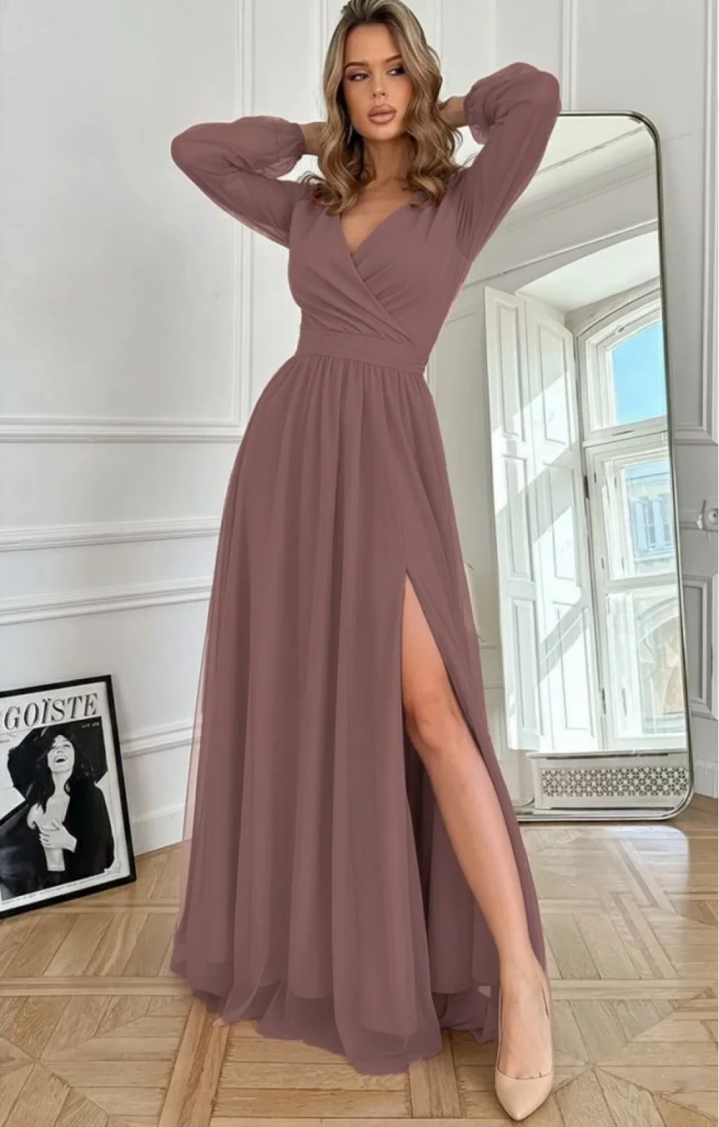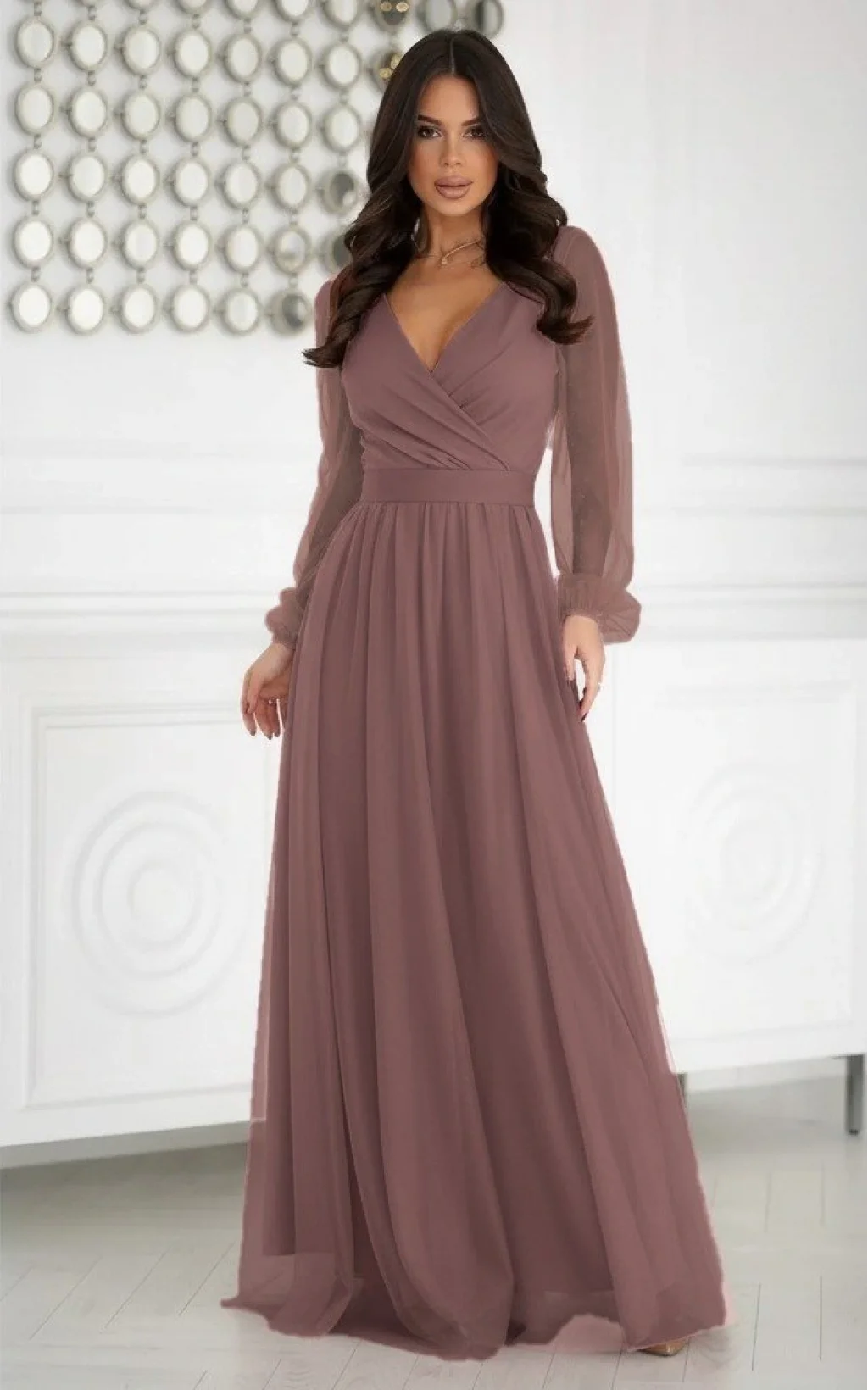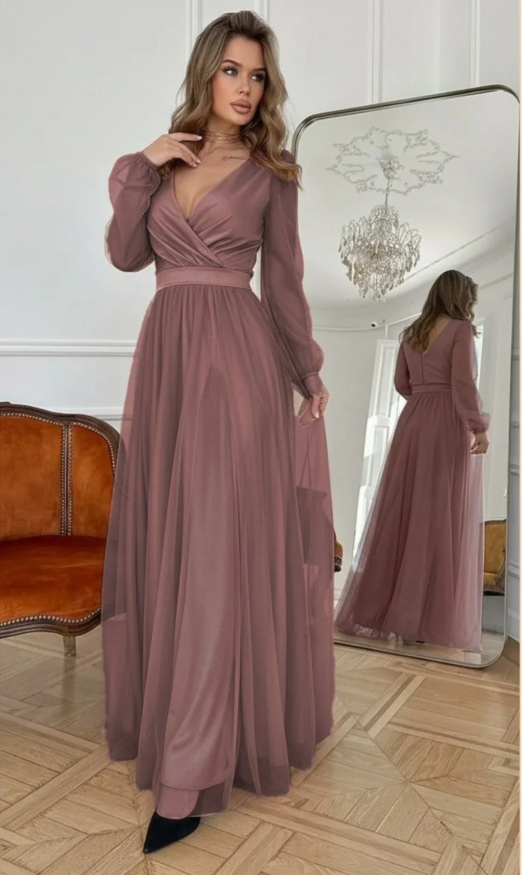 Kadın Uzun Kollu Kruvaze Yakalı Belden Kuşaklı Tüllü Uzun Ithal Krep Elbise