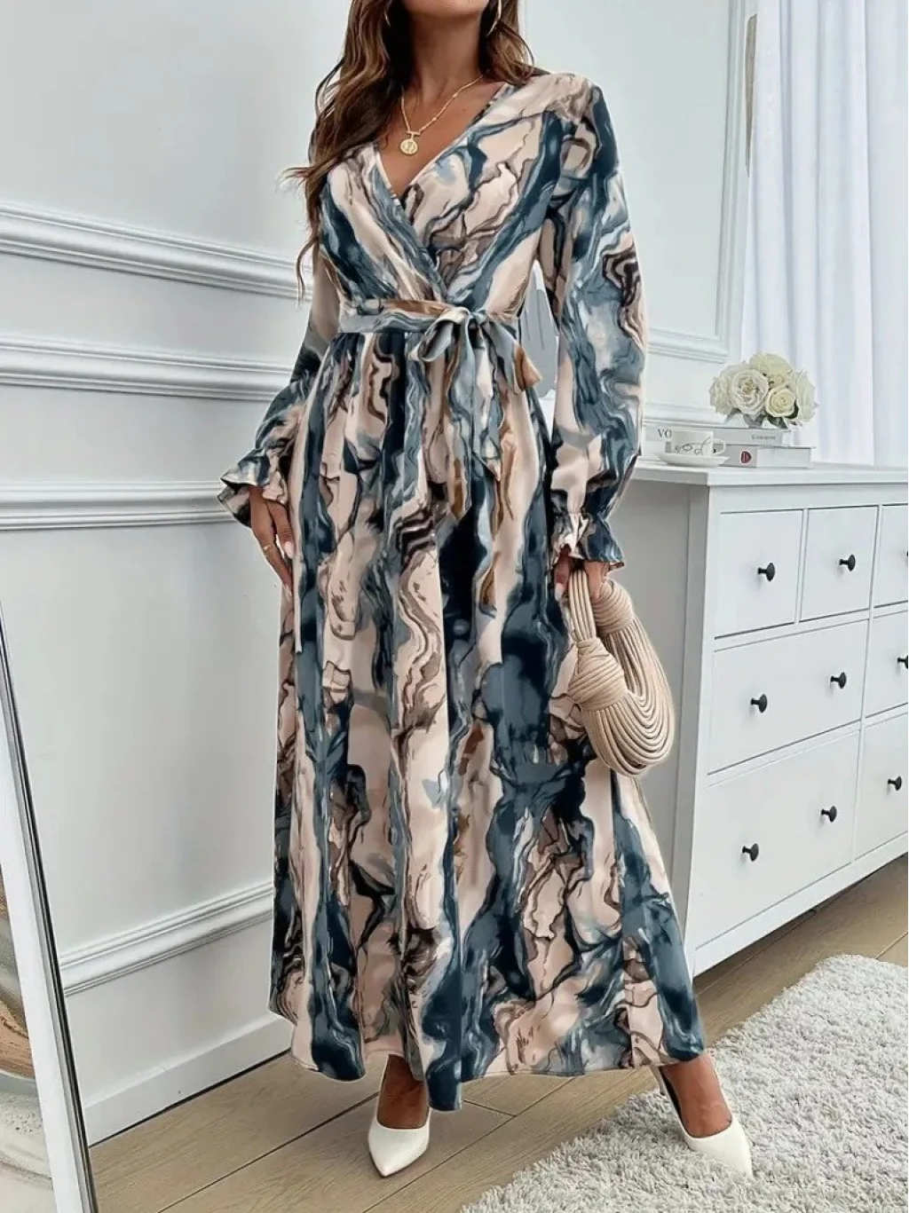 Kadın Uzun Kollu Kruvaze Yakalı Beli Kuşaklı Desenli Süprem Maxi Elbise