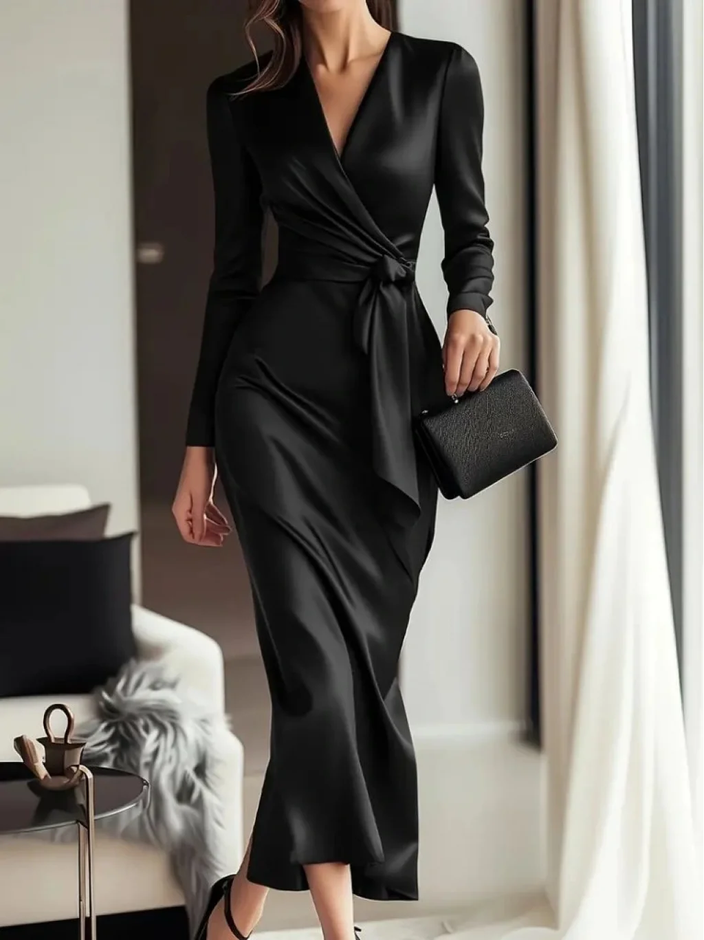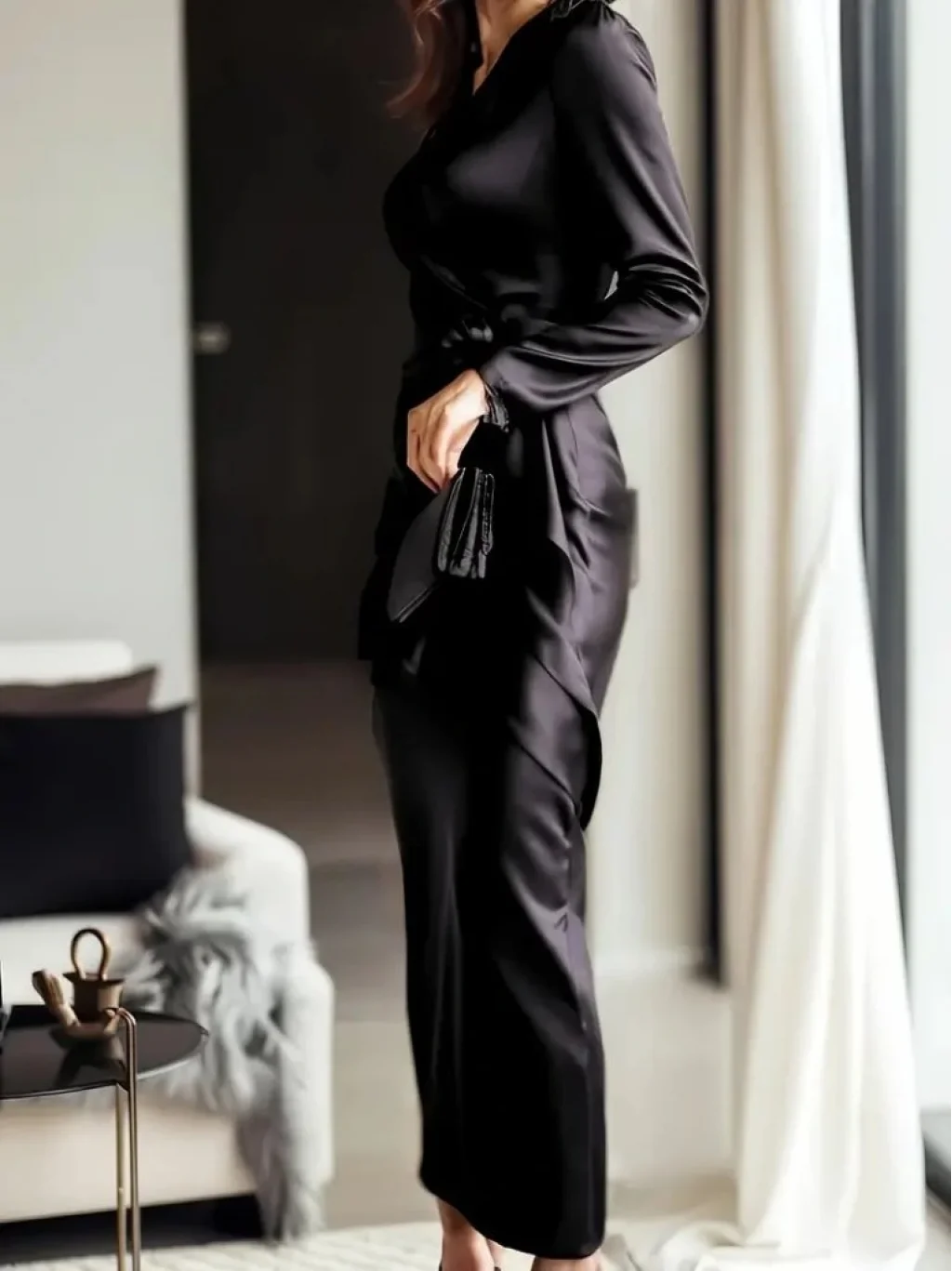 Kadın Uzun Kollu Kruvaze Yakalı Beli Kuşaklı Uzun Saten Elbise