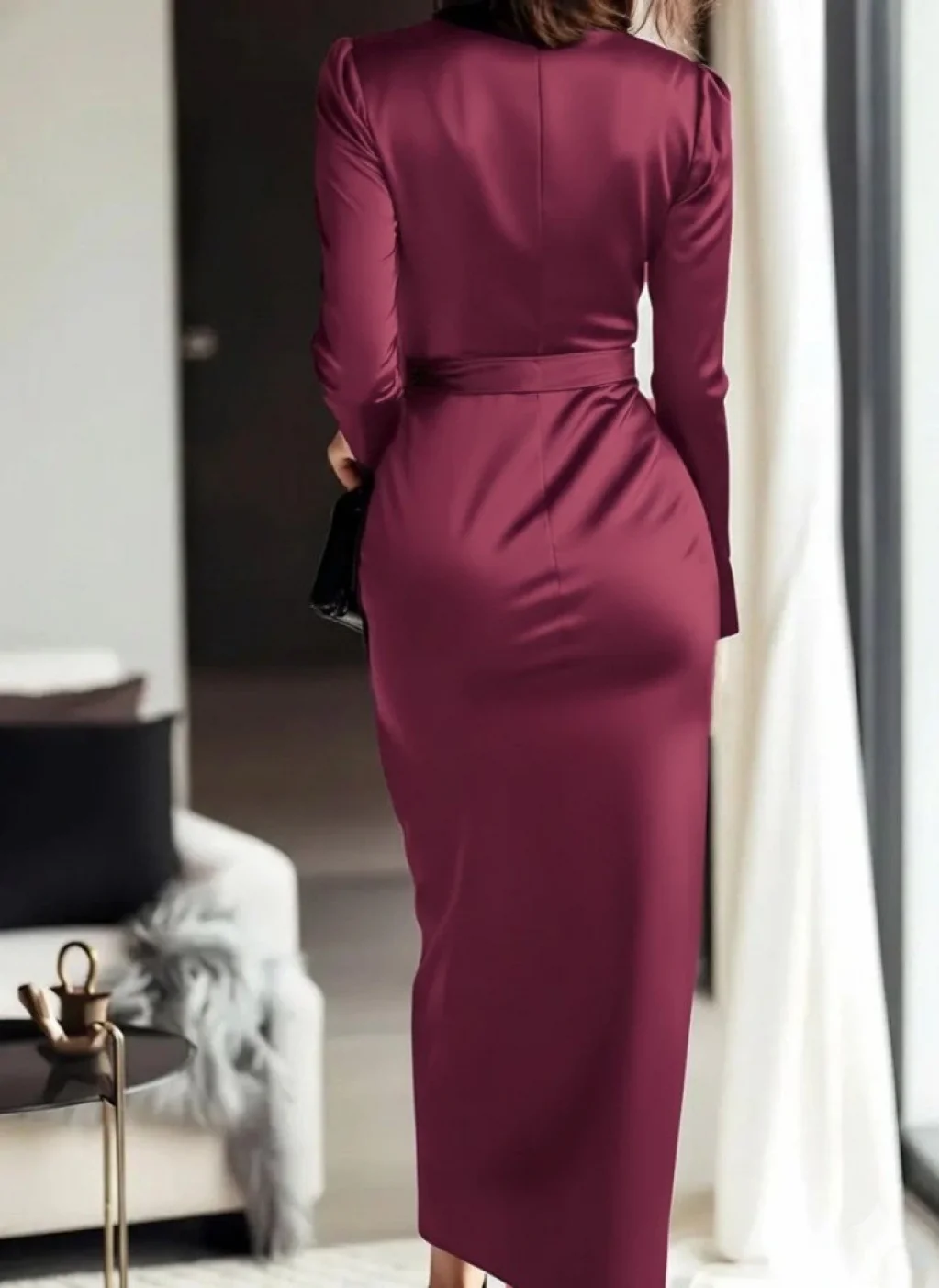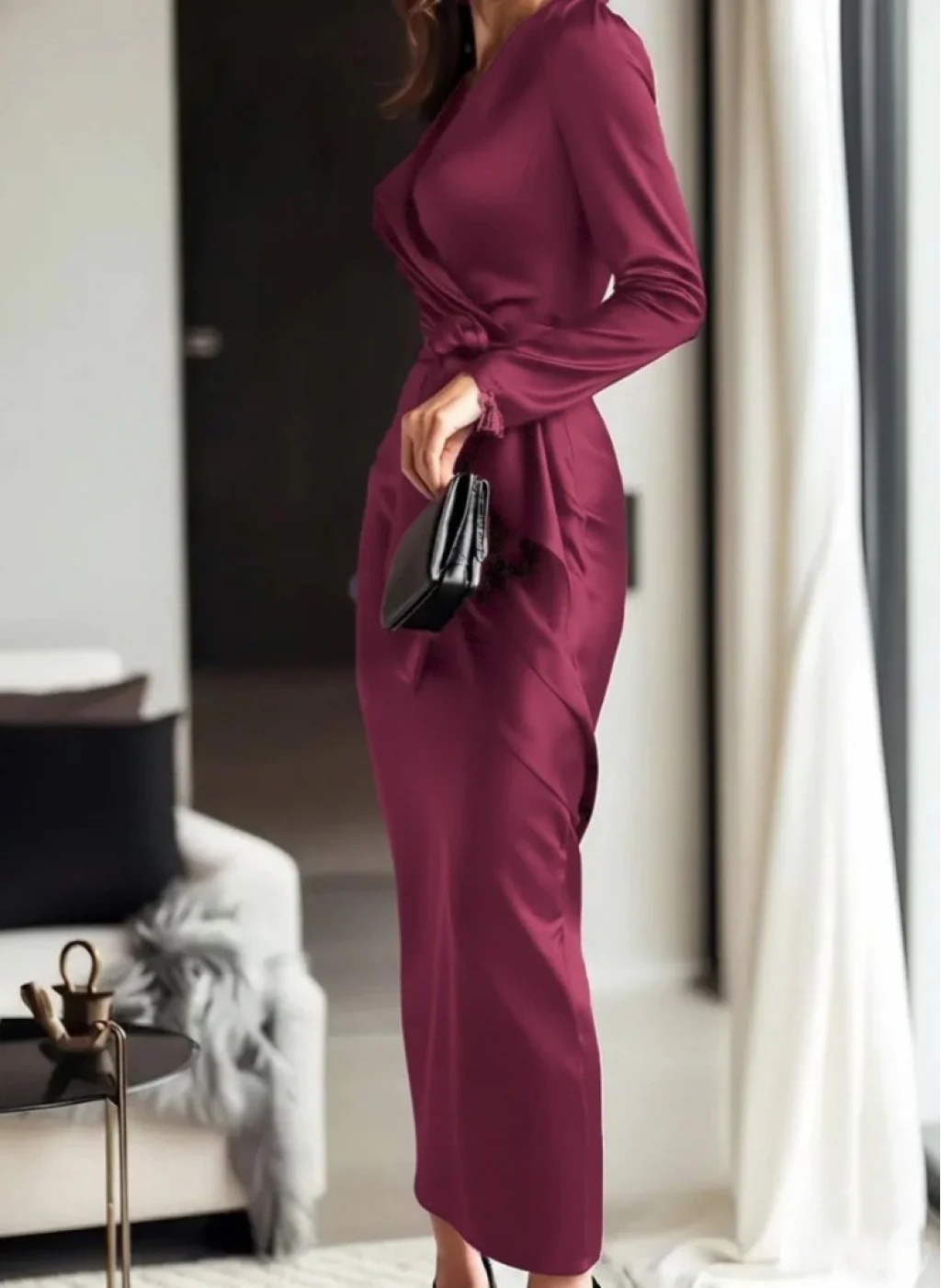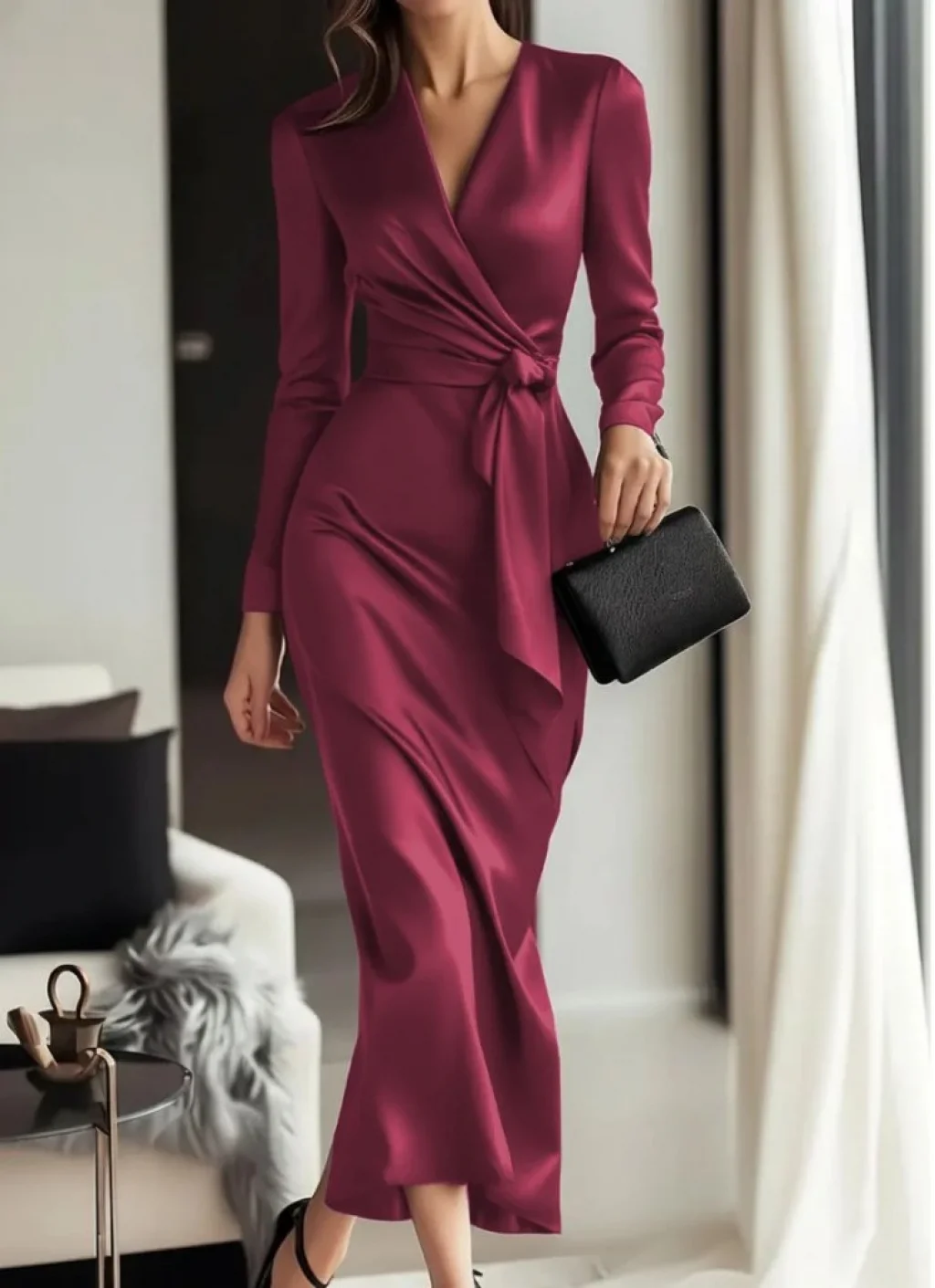 Kadın Uzun Kollu Kruvaze Yakalı Beli Kuşaklı Uzun Saten Elbise