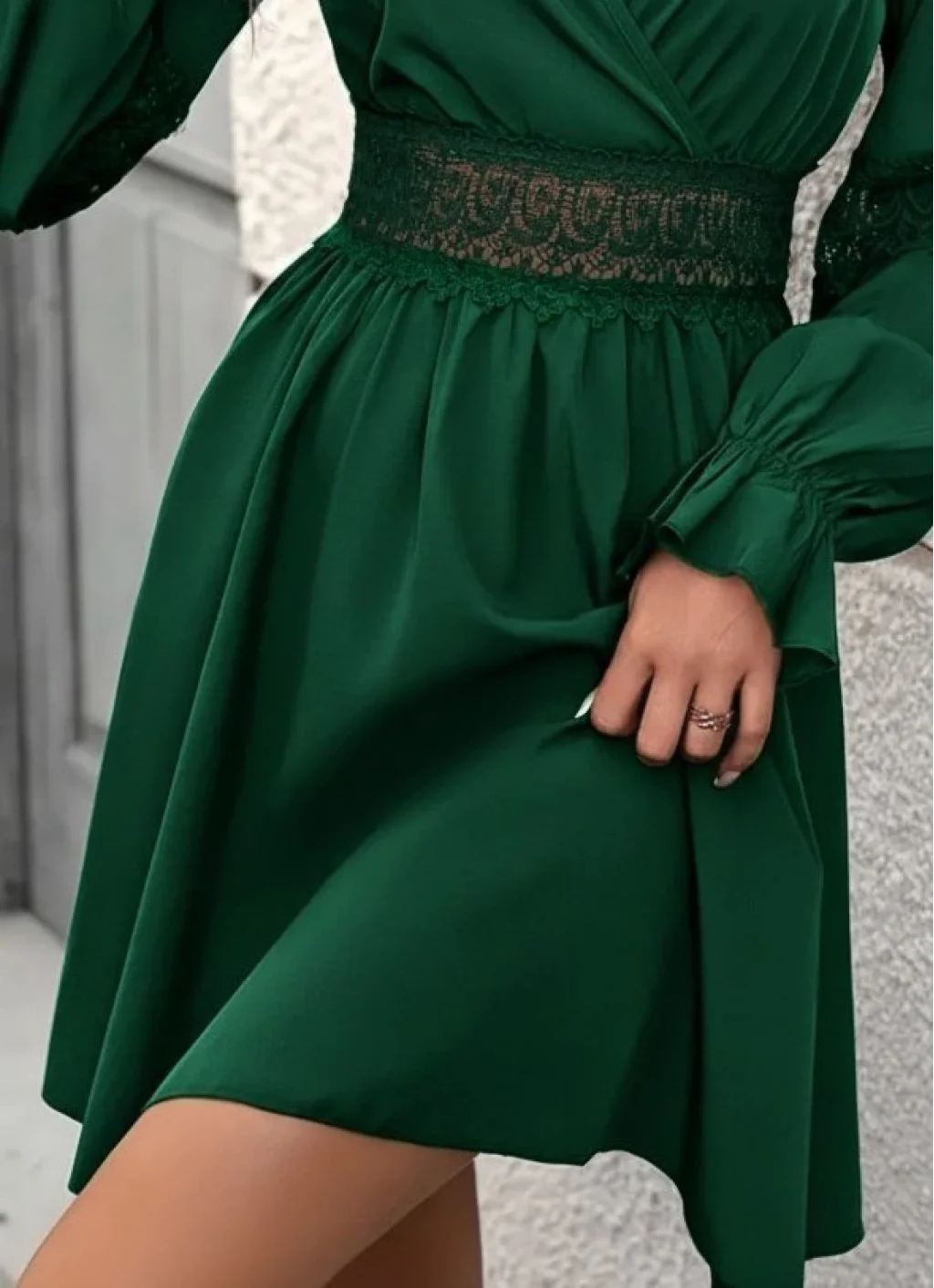 Kadın Uzun Kollu Kruvaze Yakalı Dantelli Fermuar Detaylı Mini Ithal Krep Elbise