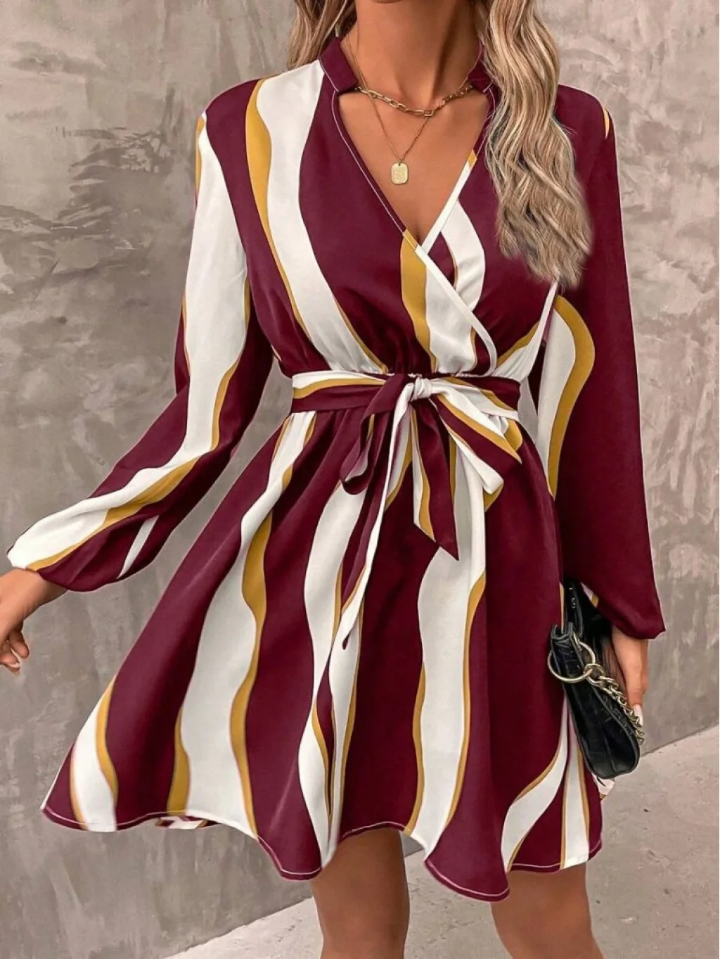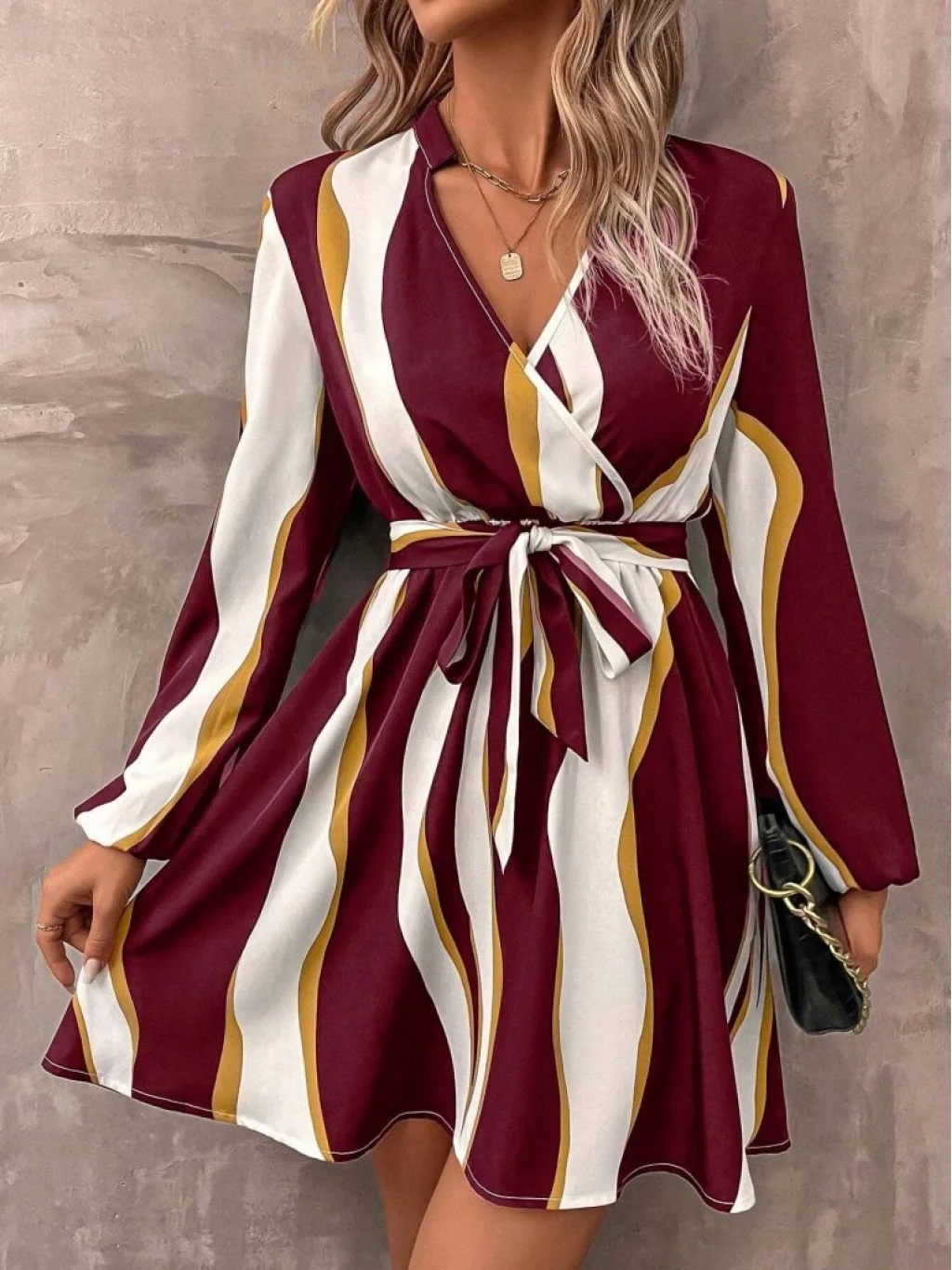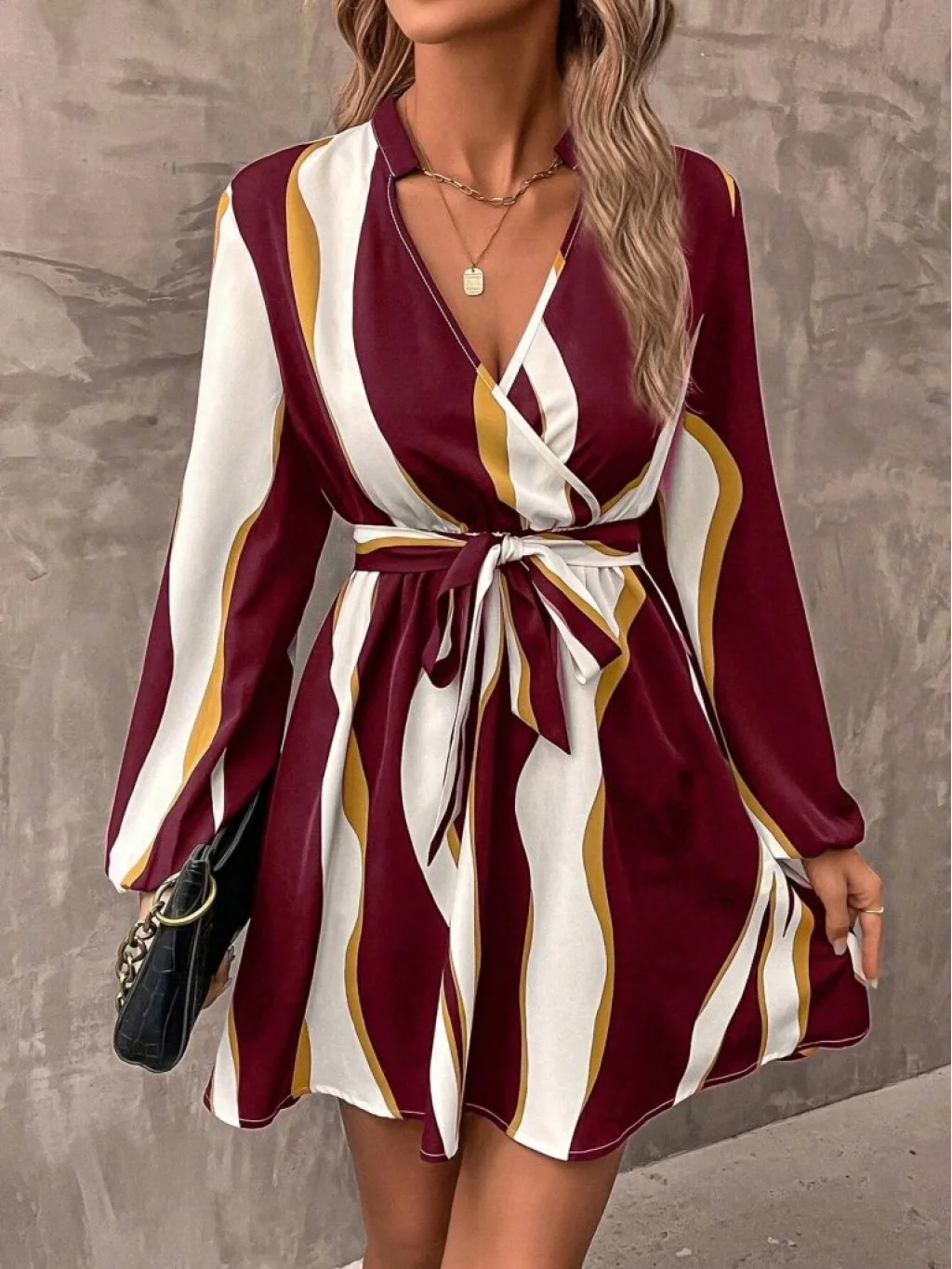 Kadın Uzun Kollu Kruvaze Yakalı Desenli Modal Mini Elbise