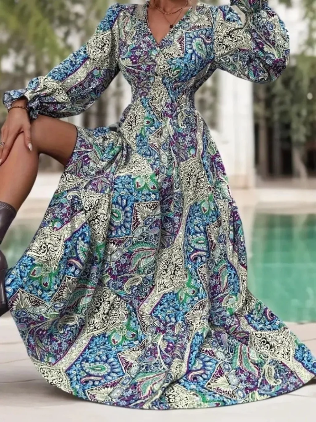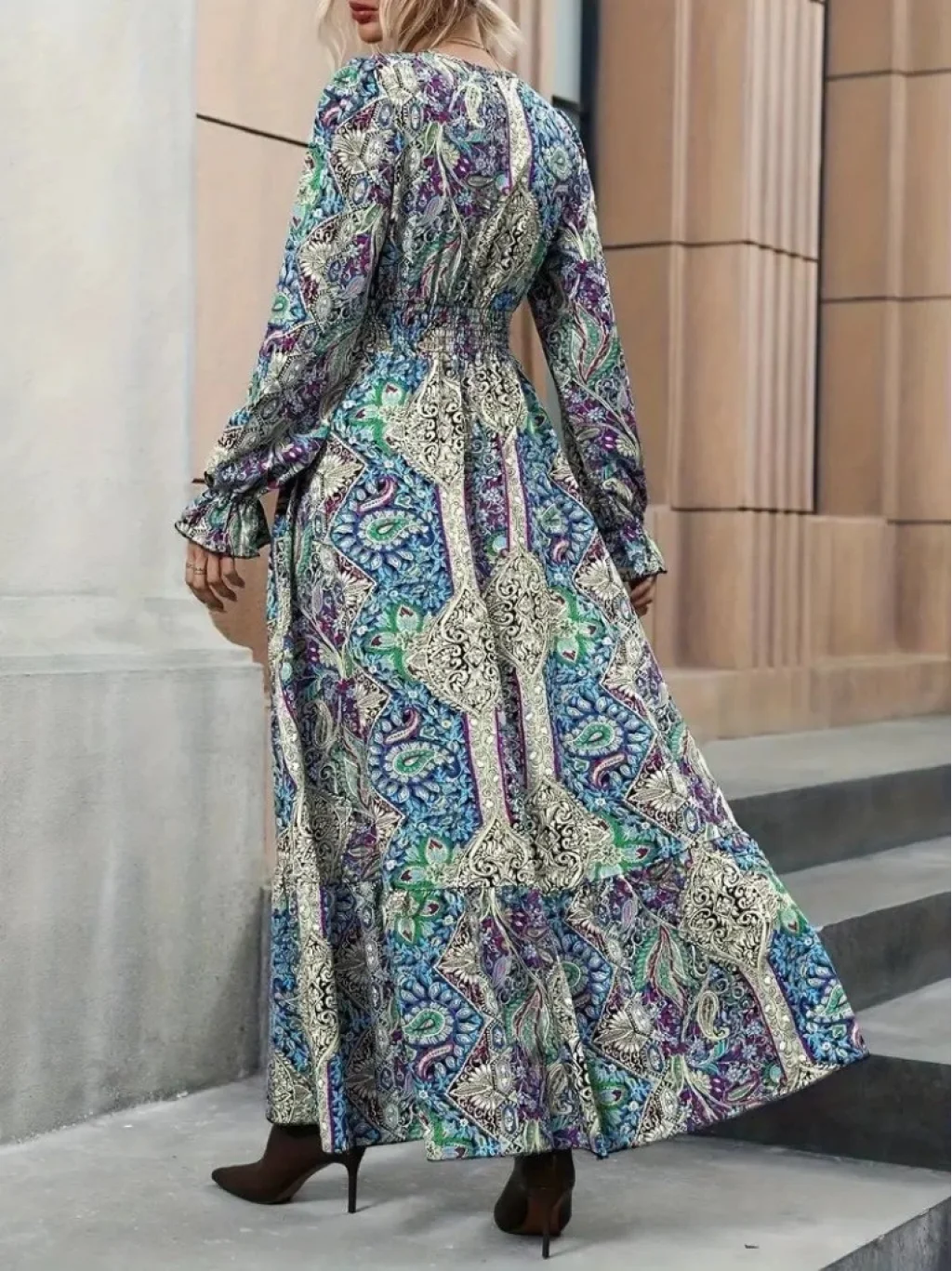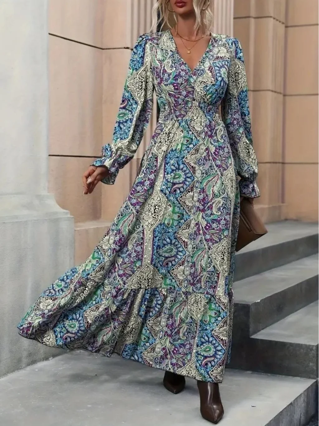 Kadın Uzun Kollu Kruvaze Yakalı Desenli Süprem Maxi Elbise