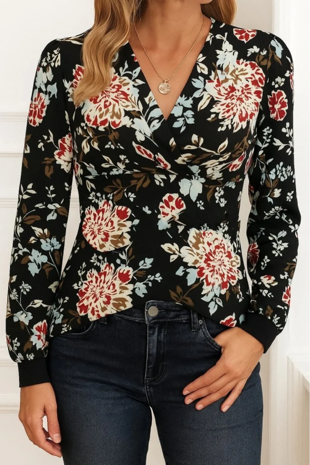 Kadın Uzun Kollu Kruvaze Yakalı Kelebek Desenli şardonlu Dalgıç Bluz