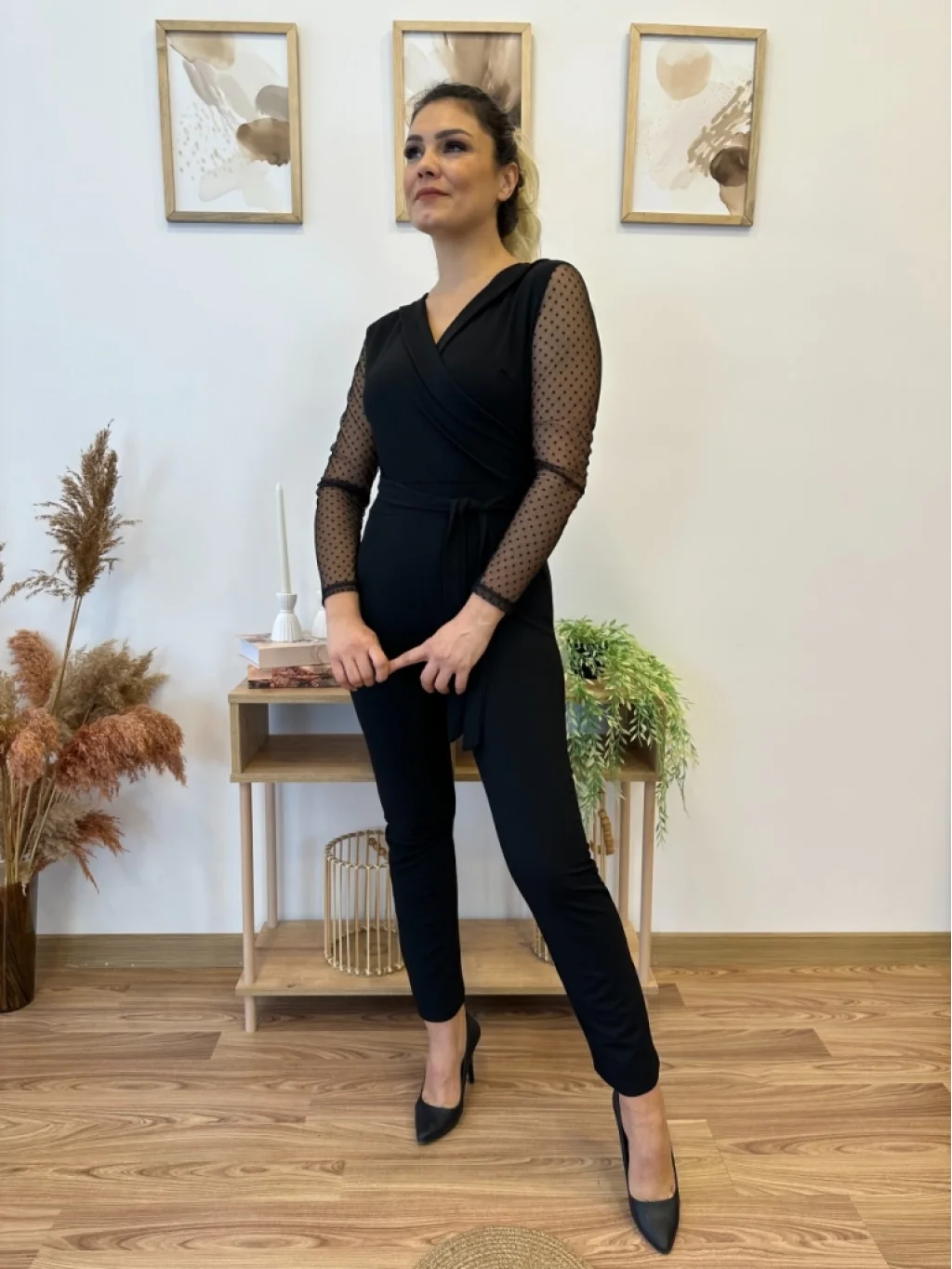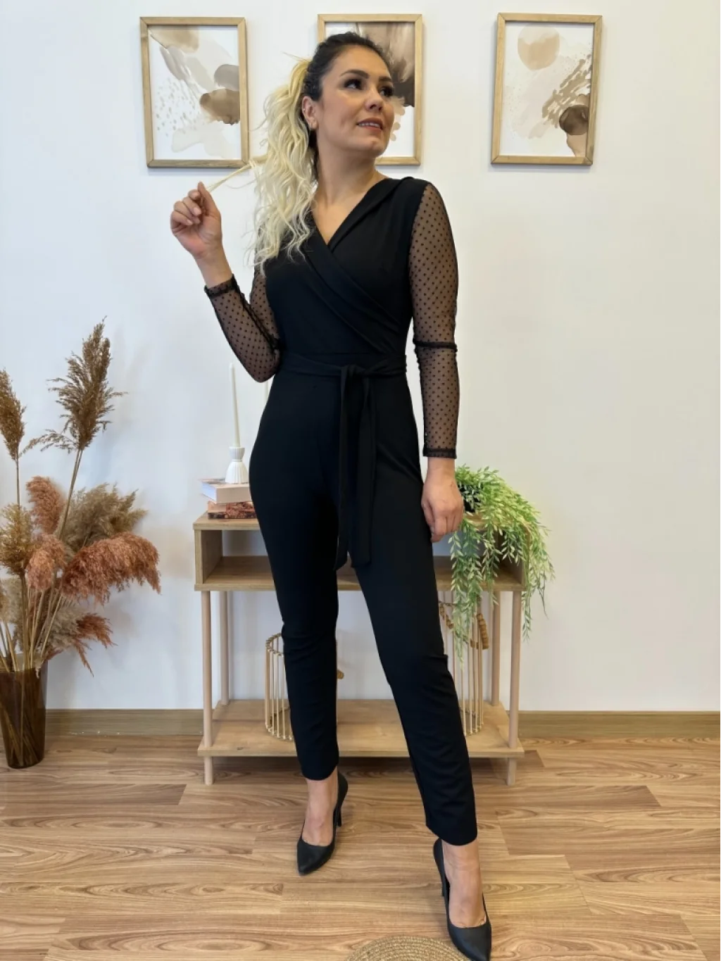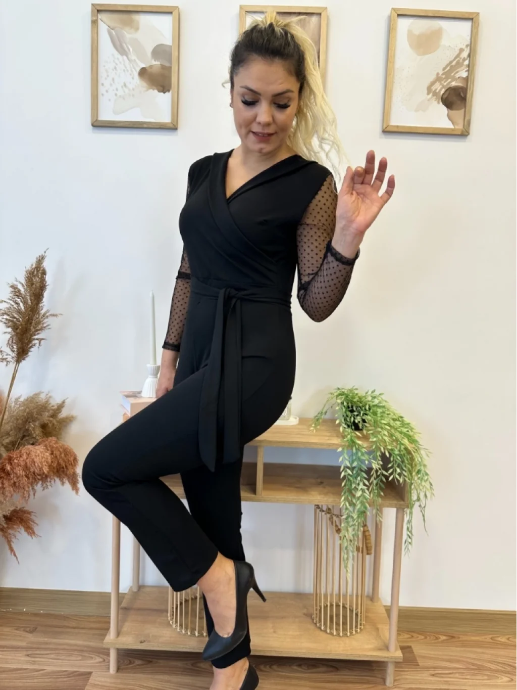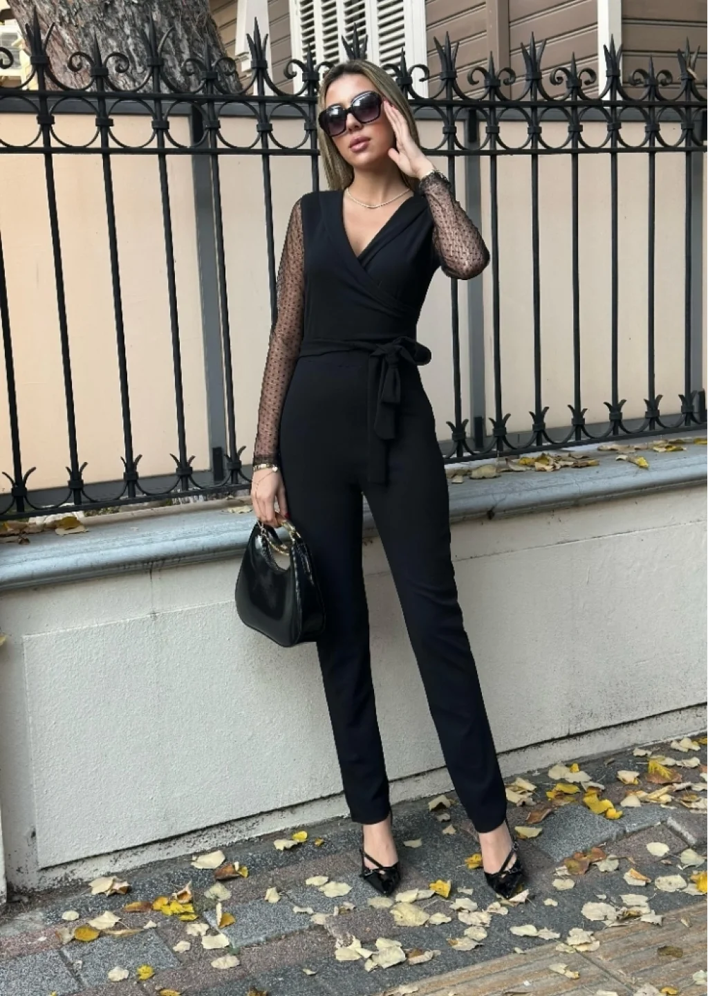 Kadın Uzun Kollu Kruvaze Yakalı Kolları Tül Detay Beli Kuşaklı Ithal Krep Tulum