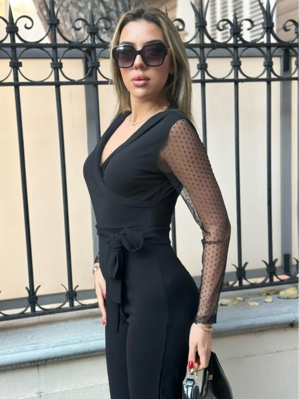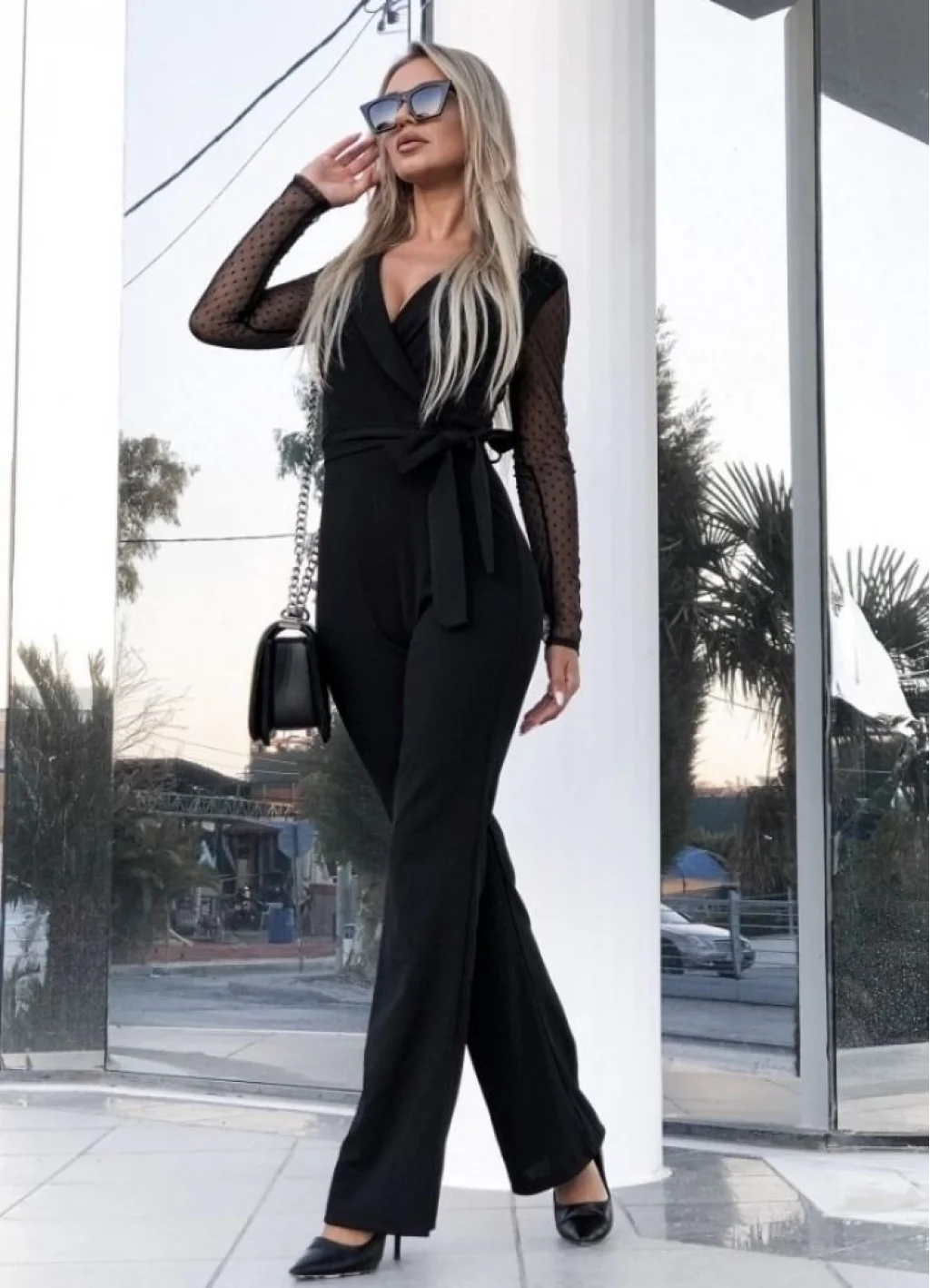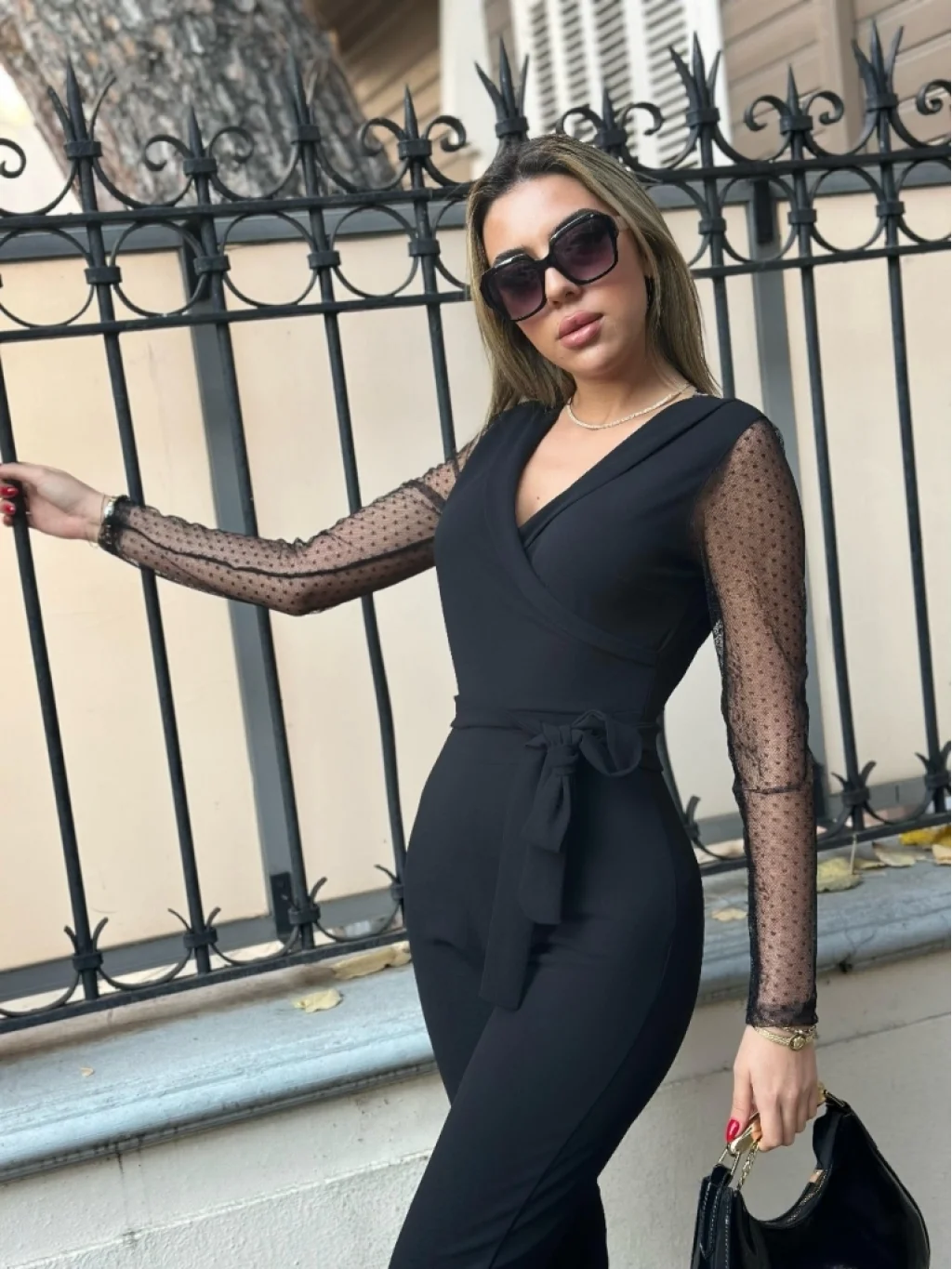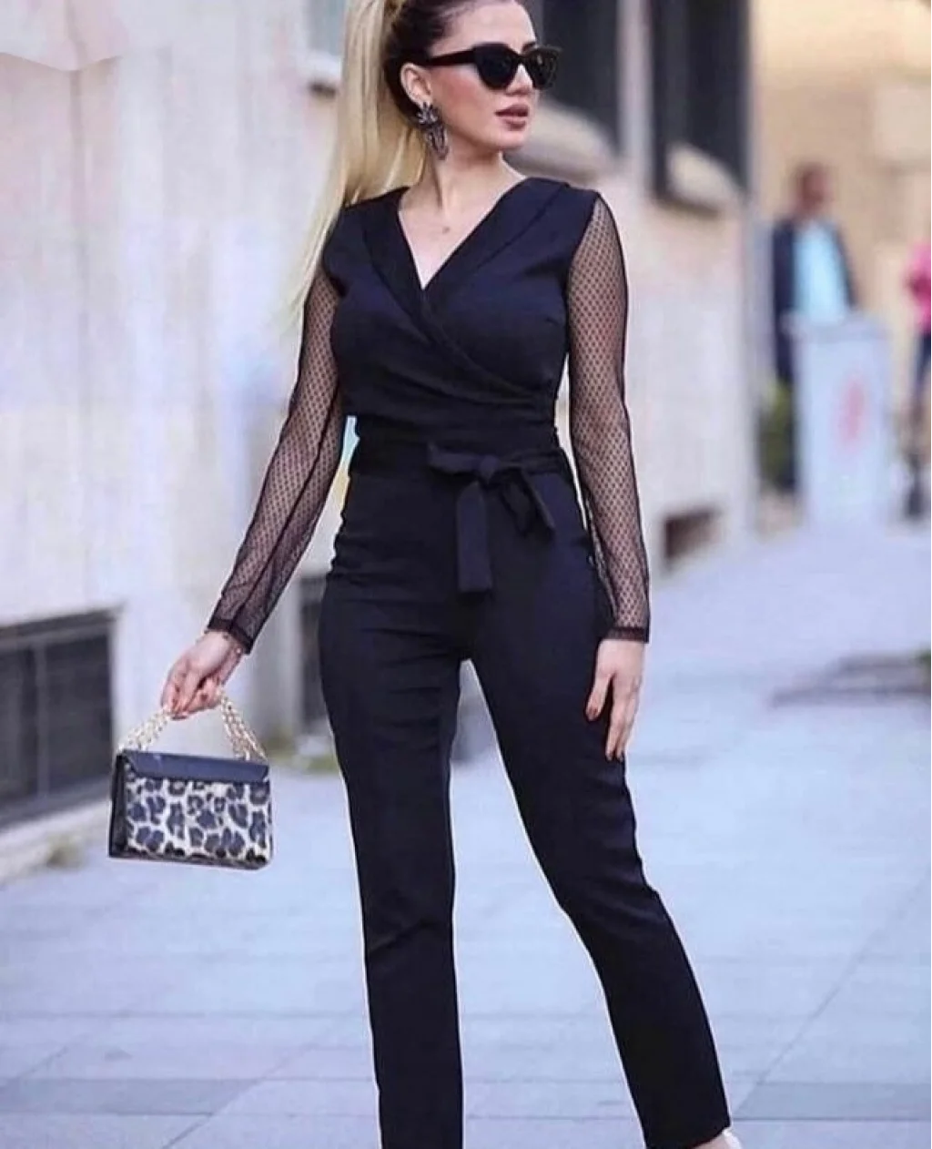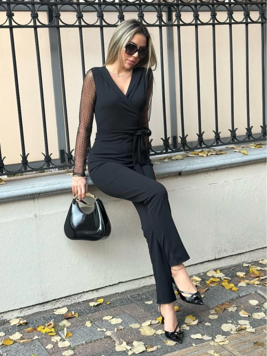 Kadın Uzun Kollu Kruvaze Yakalı Kolları Tül Detay Beli Kuşaklı Ithal Krep Tulum