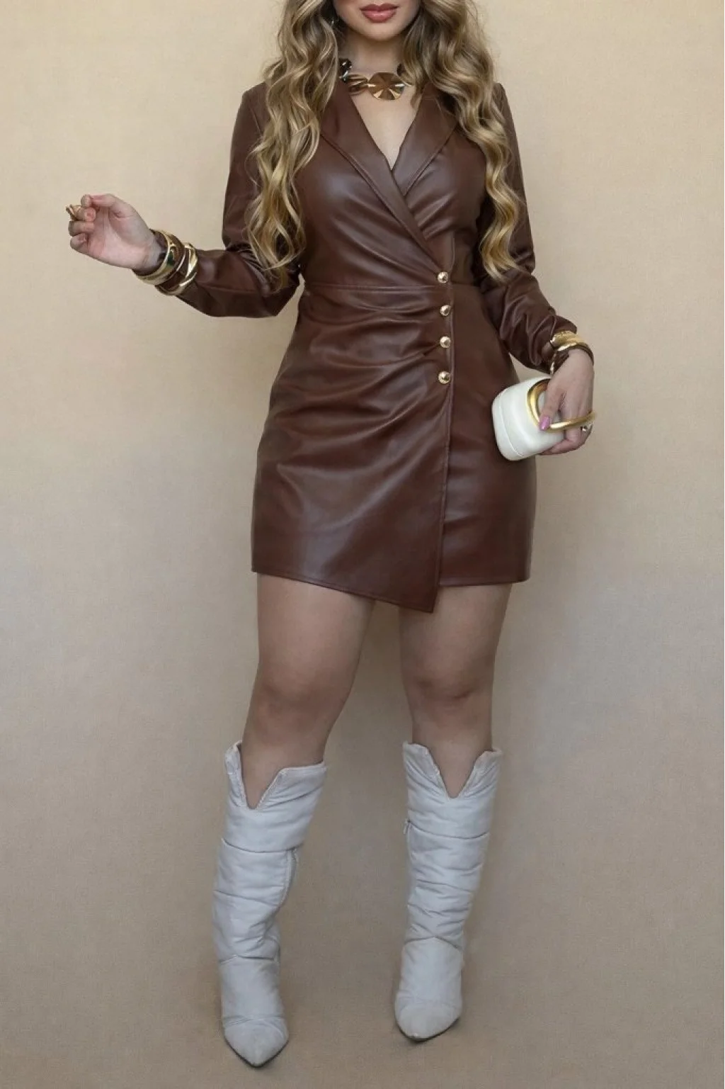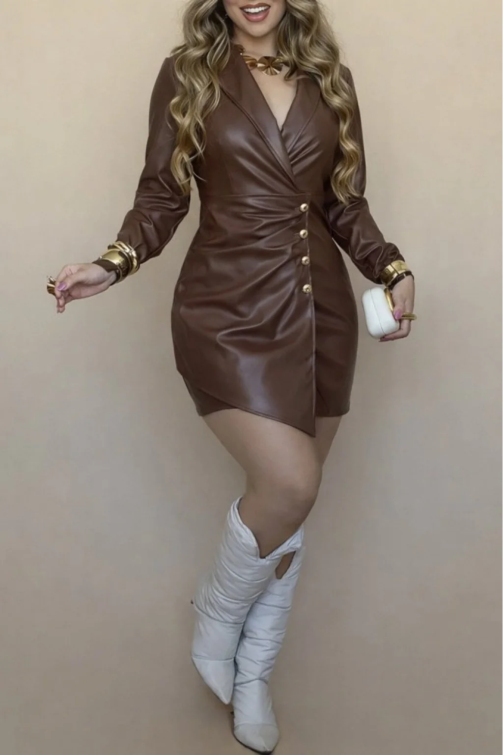 Kadın Uzun Kollu Kruvaze Yakalı önden Büzgü Ve Düğmeli Asimetrik Kesim Detaylı Mini Deri Elbise