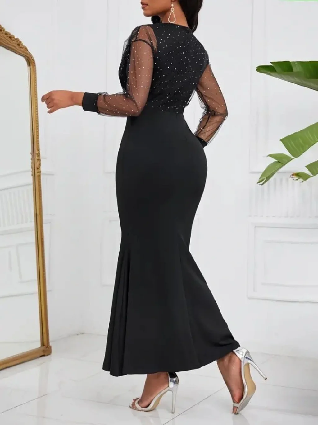 Kadın Uzun Kollu Kruvaze Yakalı Taş Ve Tül Detaylı Uzun Ithal Krep Elbise