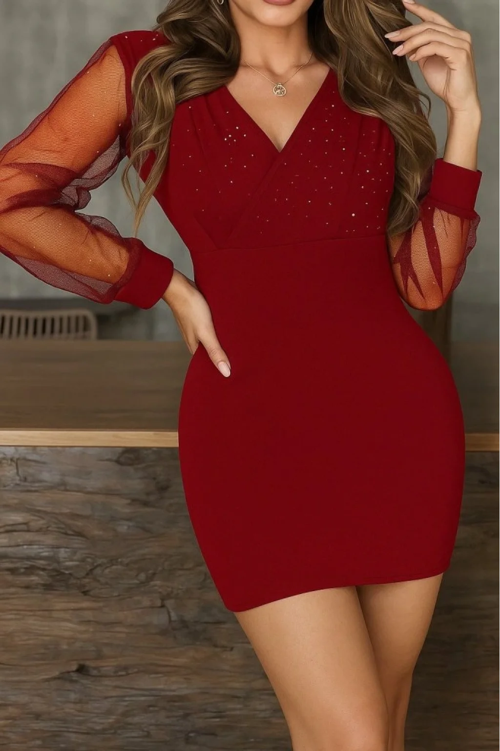 Kadın Uzun Kollu Kruvaze Yakalı Taşlı Mini Ithal Krep Elbise