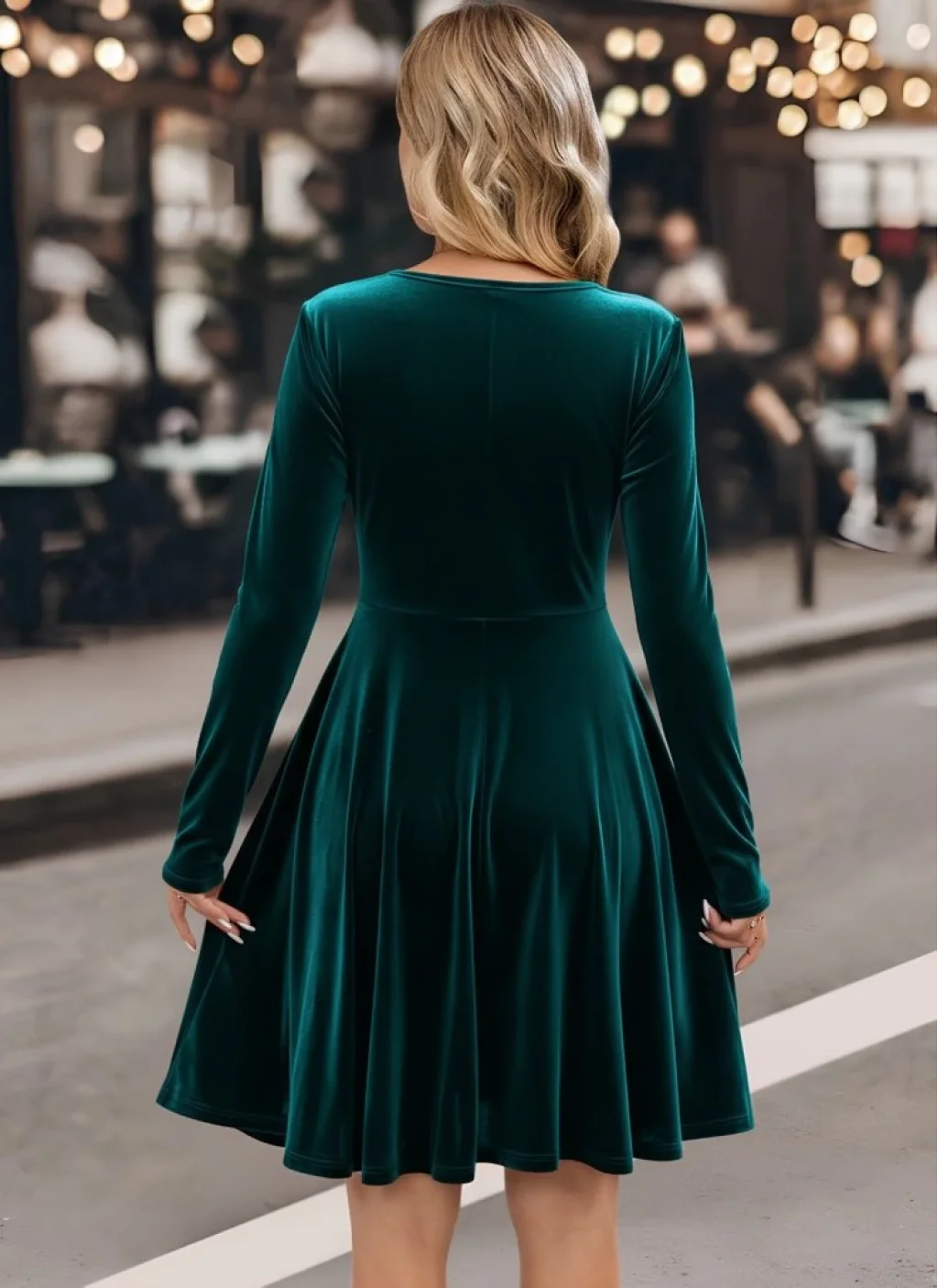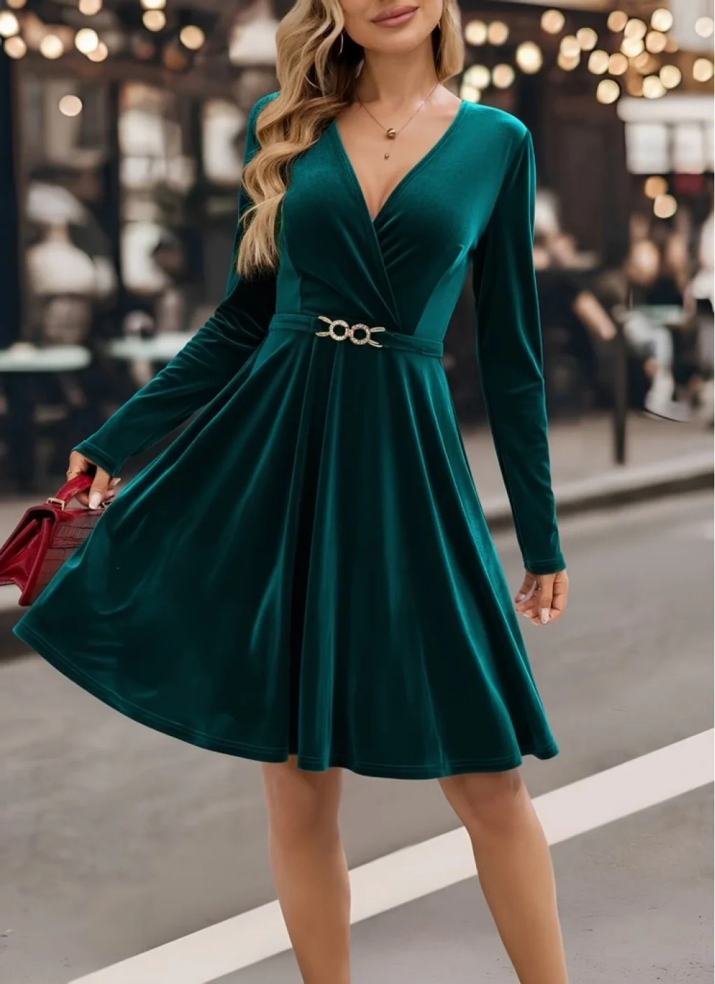 Kadın Uzun Kollu Kruvaze Yakalı Toka Detaylı Mini Kadife Elbise