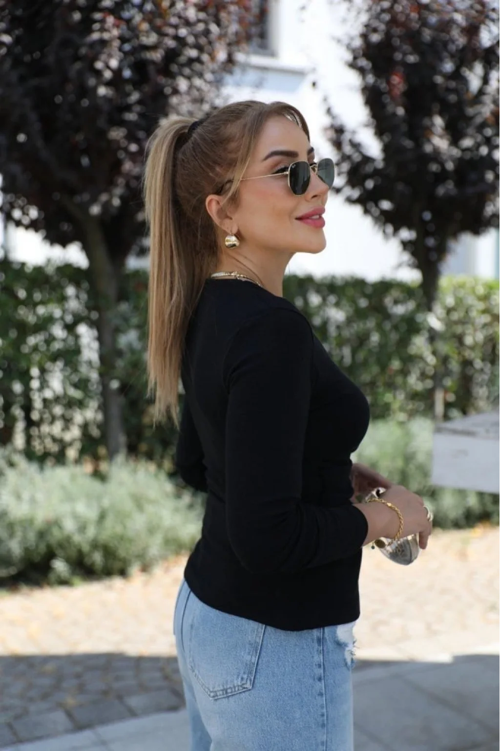 Kadın Uzun Kollu Kruvaze Yakalı Toka Detaylı Viskon Bluz