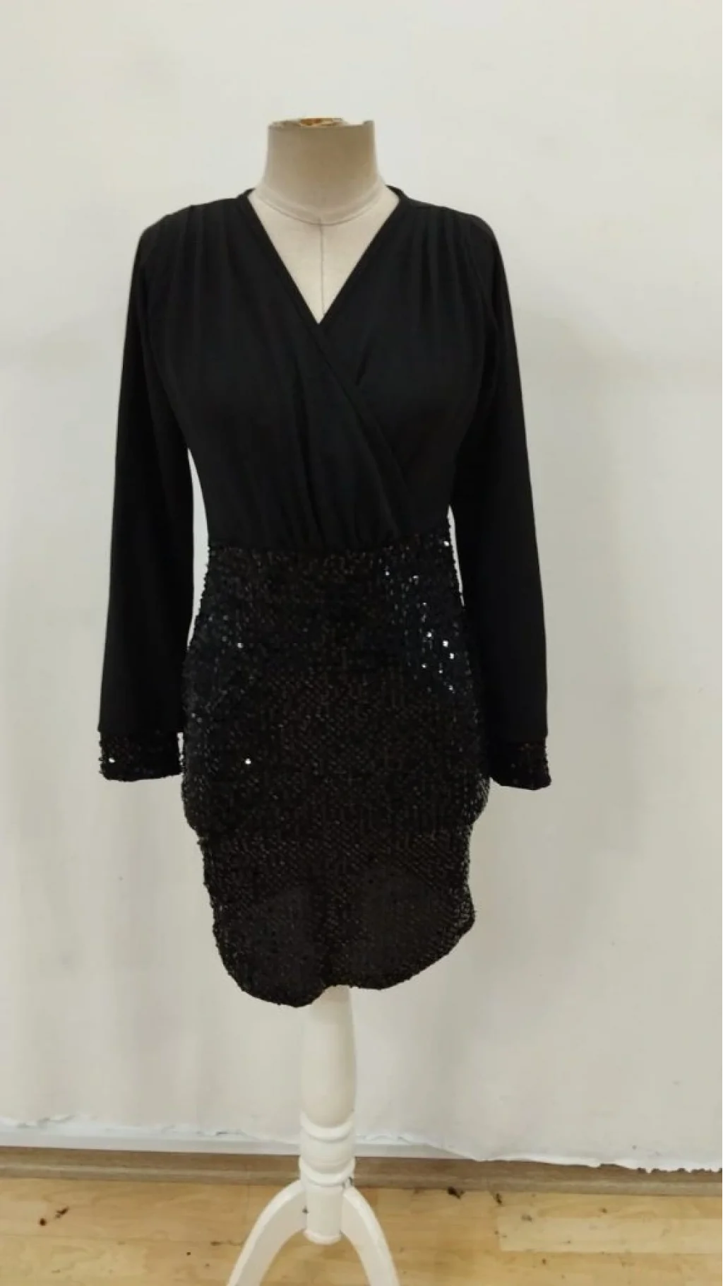 Kadın Uzun Kollu Kruvaze Yakalı üst Ithal Krep Alt Pulpayetli Mini Ithal Krep Elbise