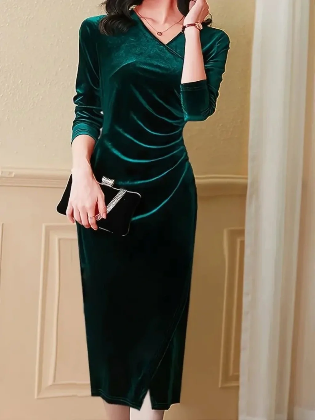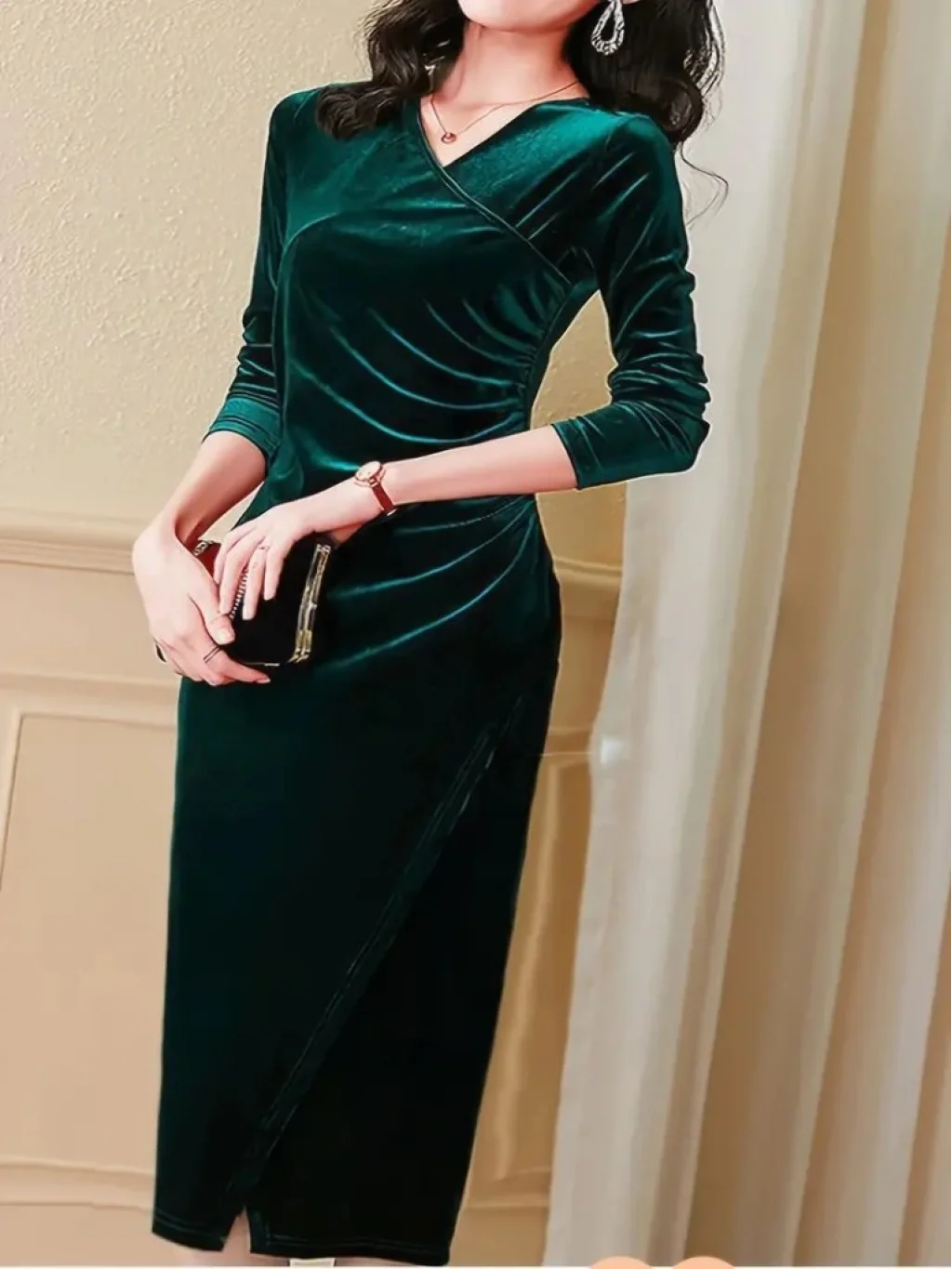 Kadın Uzun Kollu Kruvaze Yakalı Yandan Büzgülü önden çapraz Detaylı Midi Kadife Elbise