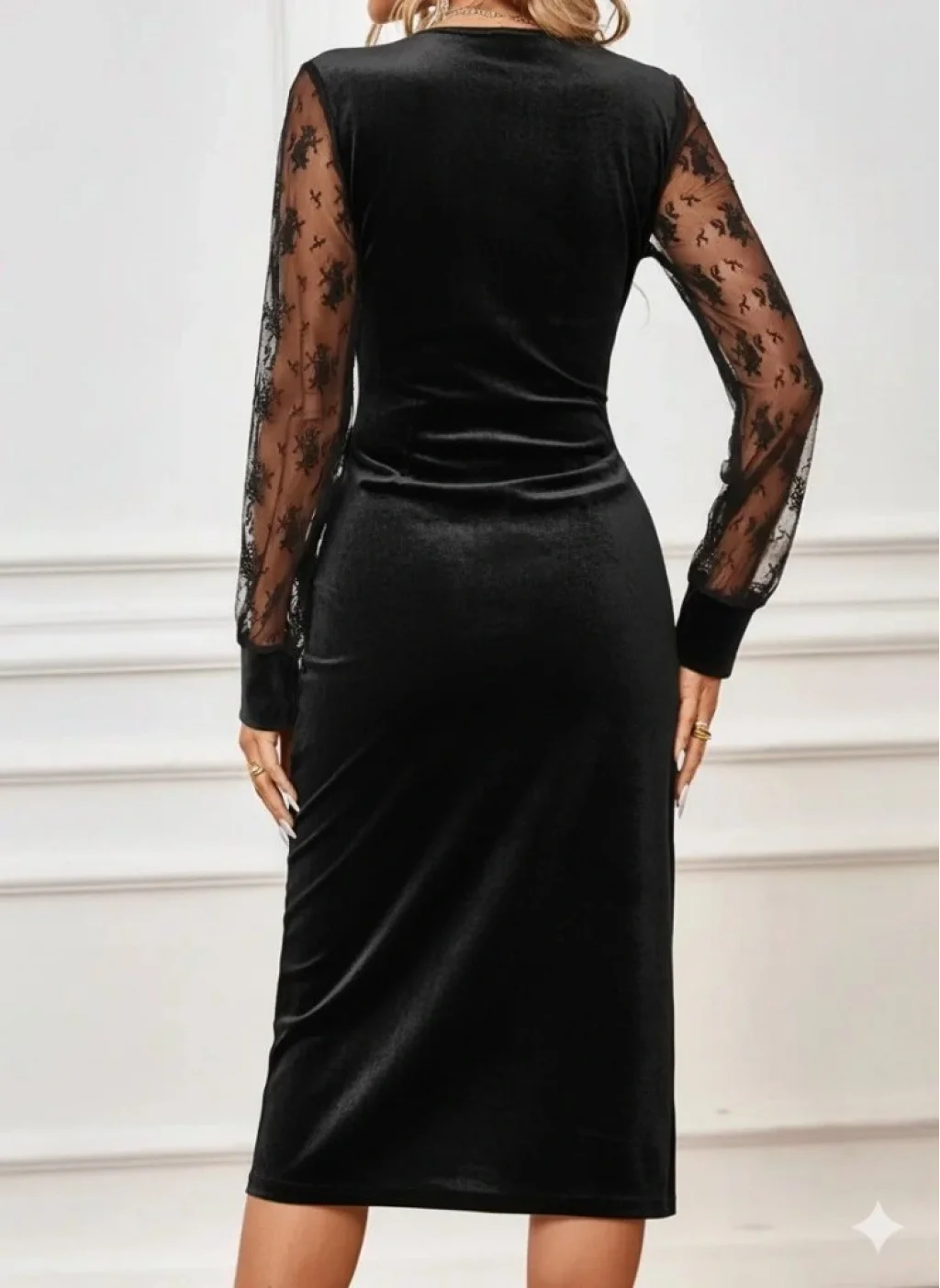 Kadın Uzun Kollu Kruvaze Yakalı Yandan Düğmeli önden çapraz Kesin Detaylı Midi Kadife Elbise