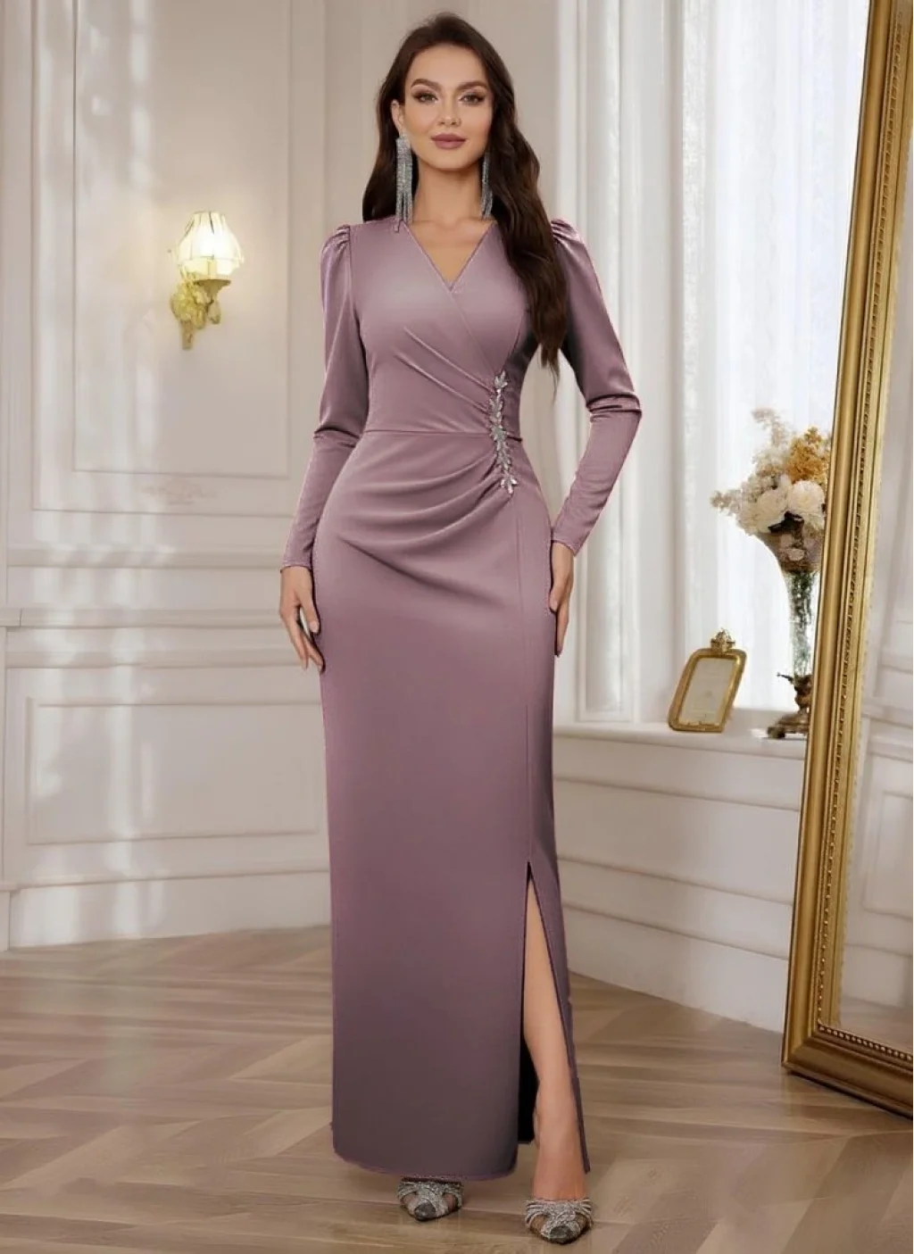 Kadın Uzun Kollu Kruvaze Yakalı Yanları Taşlı Yırtmaçlı Uzun Ithal Krep Elbise