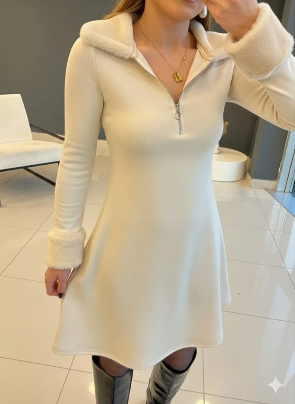 Kadın Uzun Kollu Kürk Yakalı Fermuarlı Mini Viskon Iki Iplik Elbise