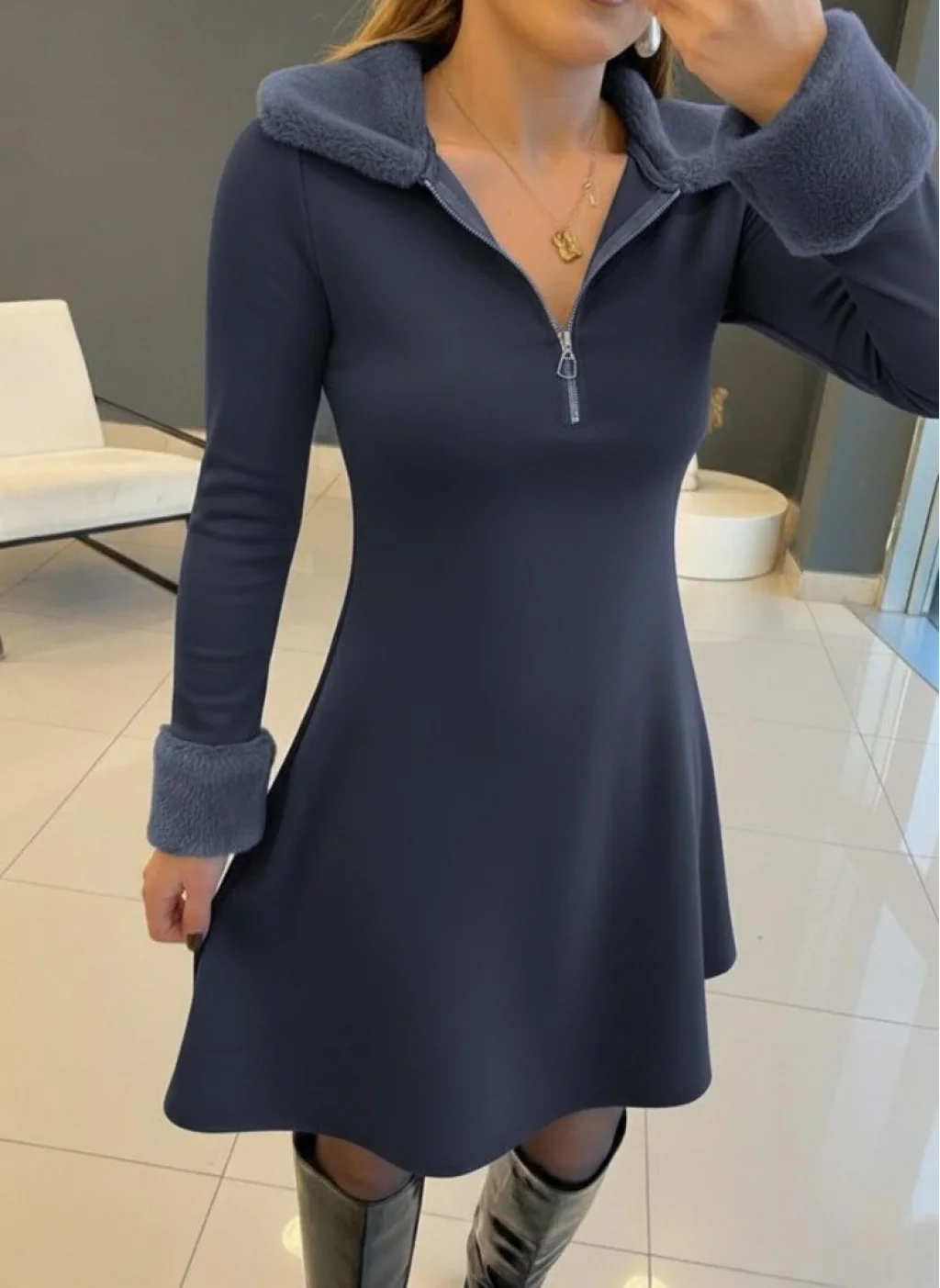 Kadın Uzun Kollu Kürk Yakalı Fermuarlı Mini Viskon Iki Iplik Elbise
