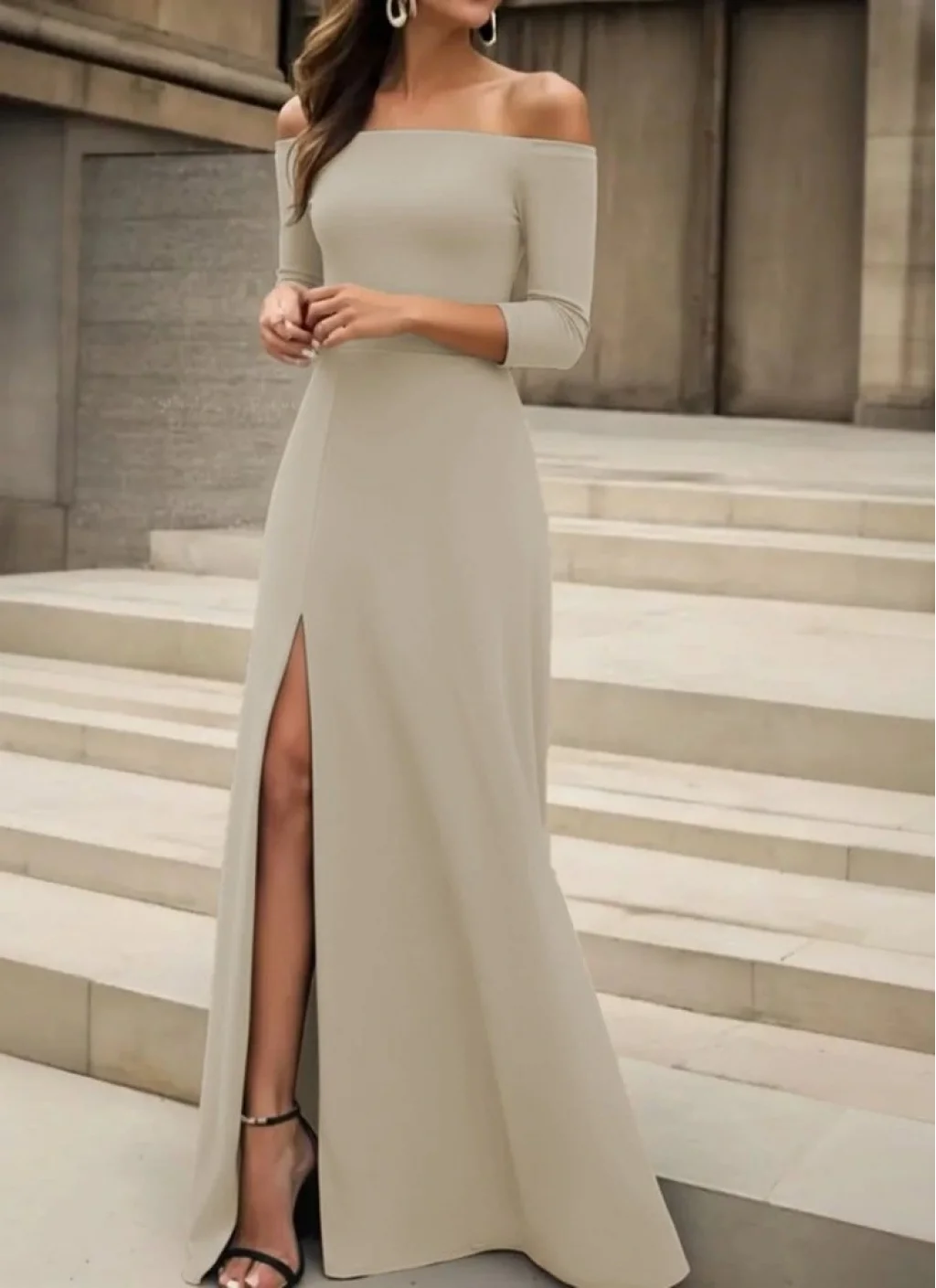 Kadın Uzun Kollu Madonna Yakalı Yırtmaç Detaylı Uzun Ithal Krep Elbise