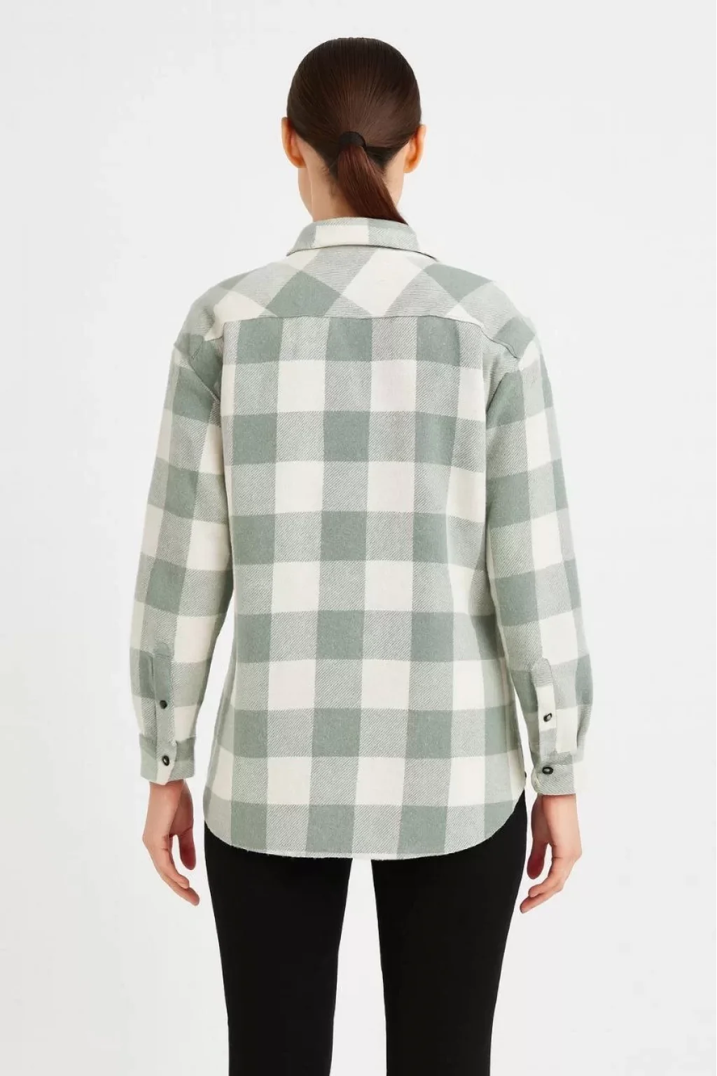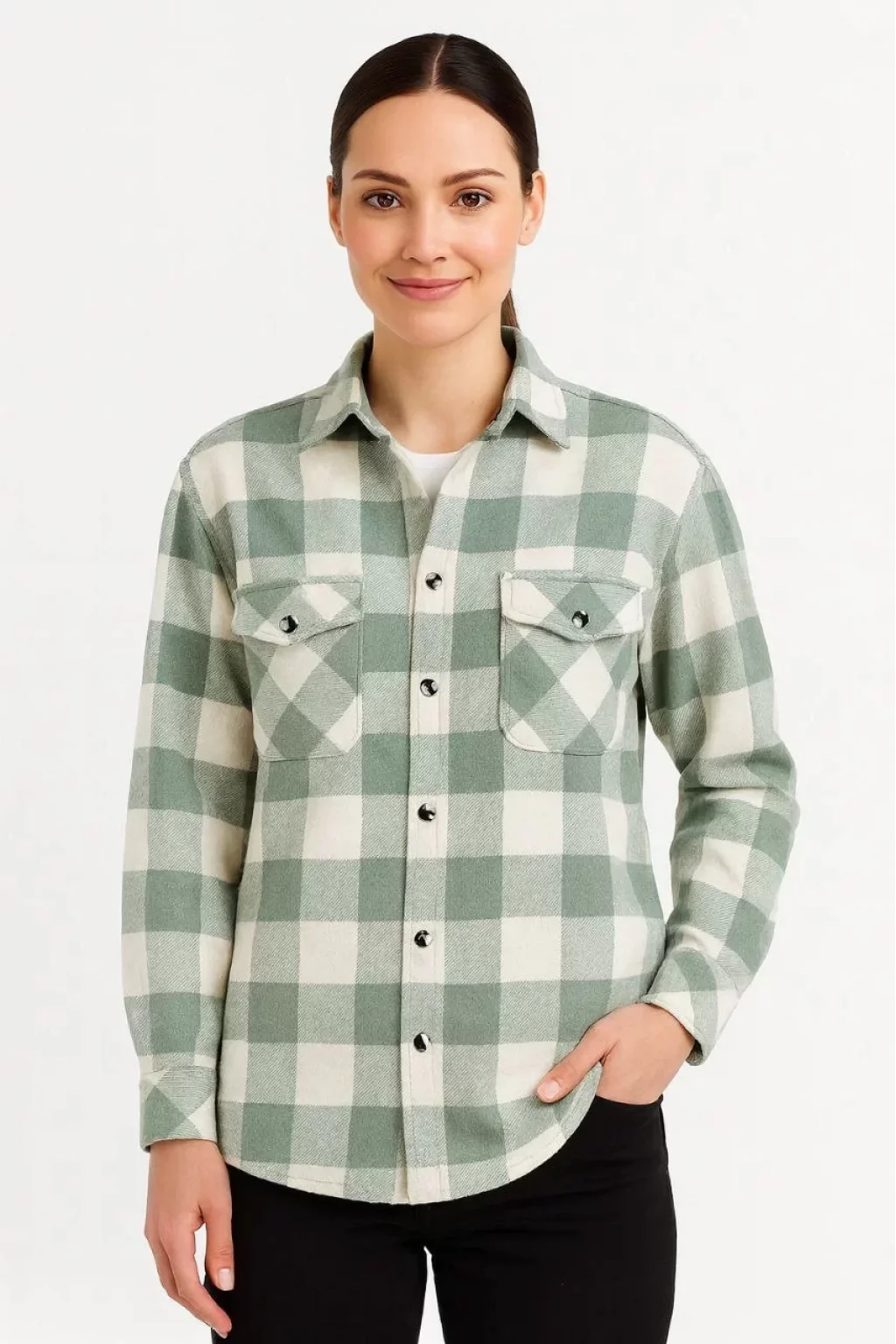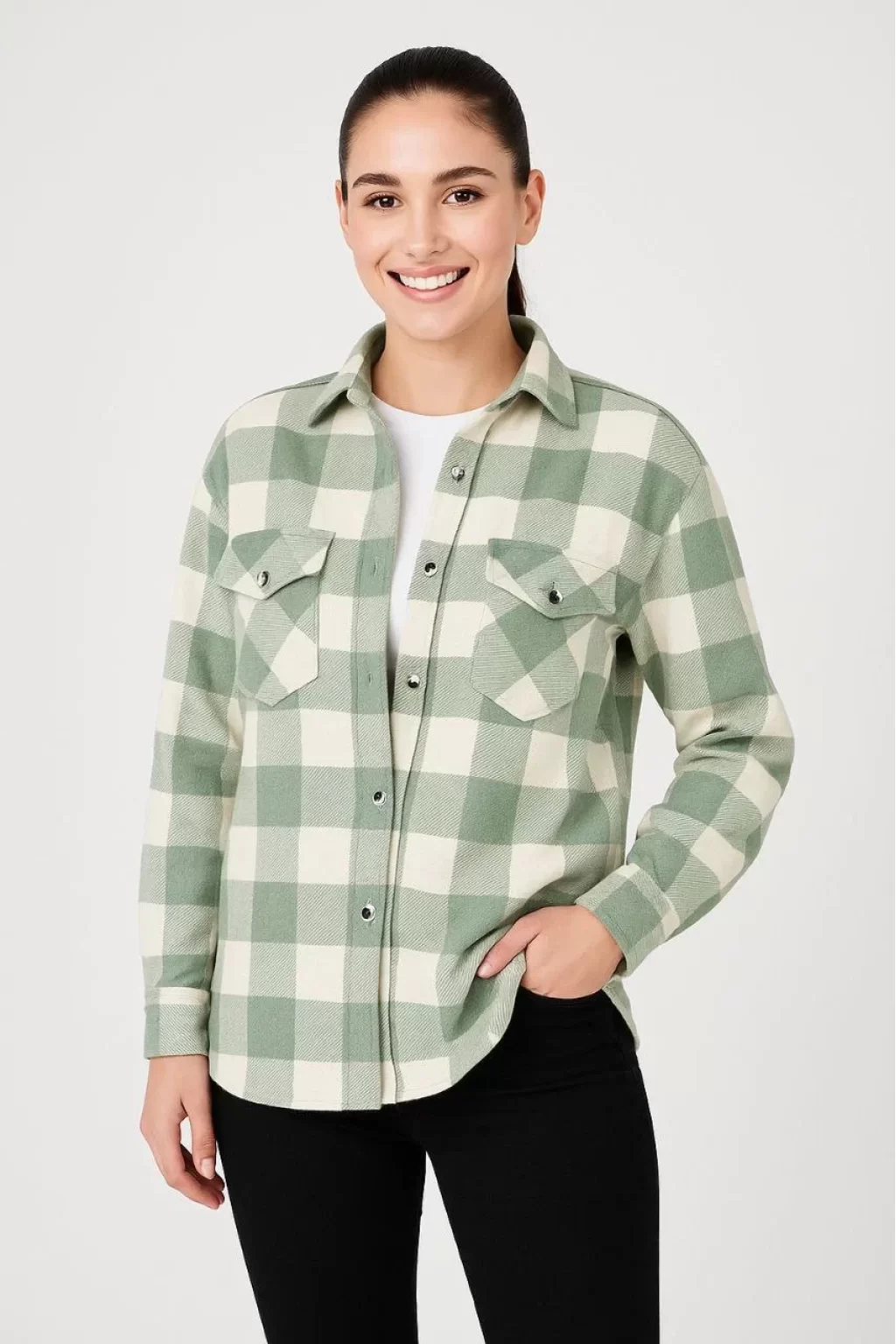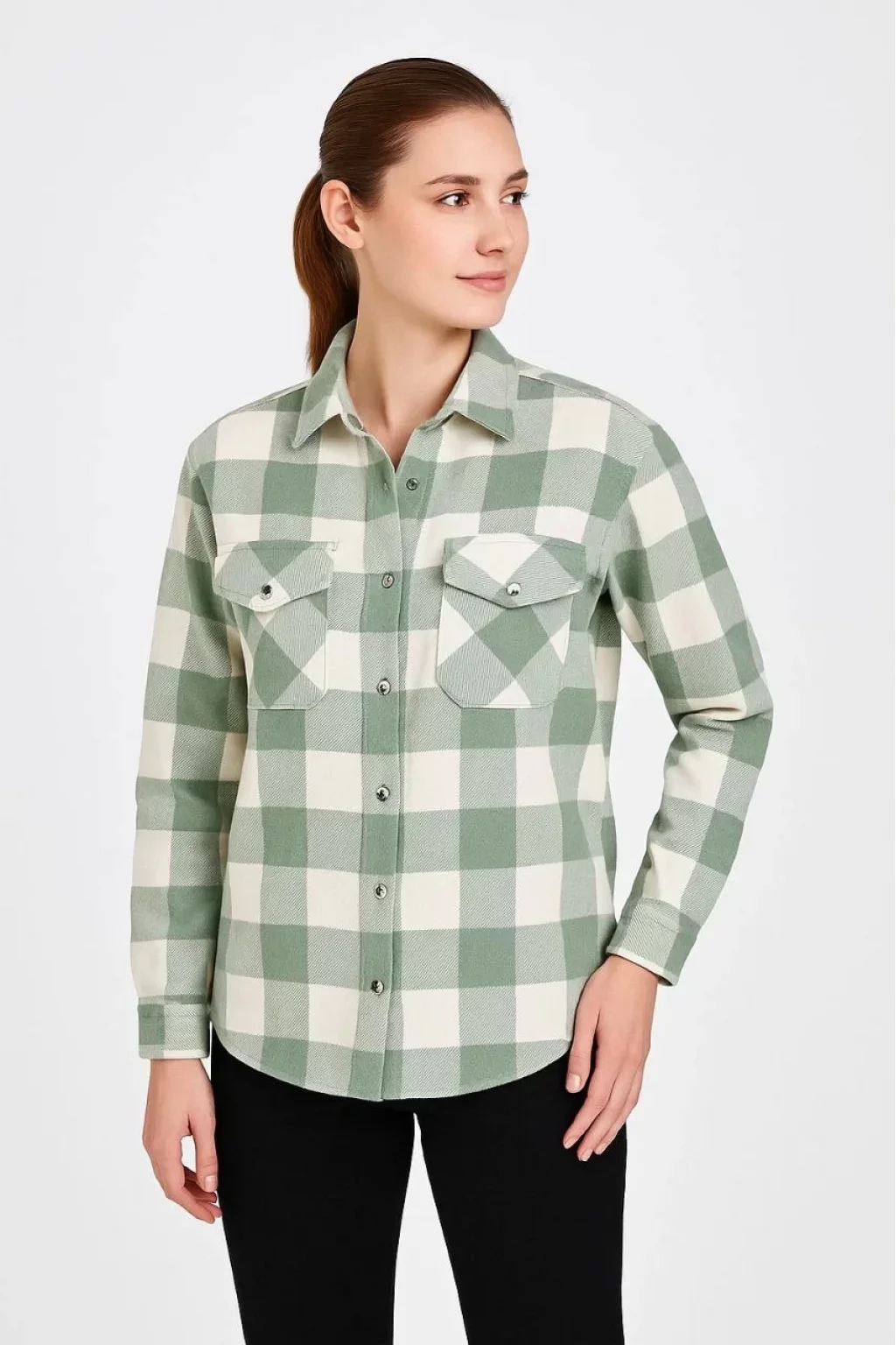 Kadın Oduncu Gömlek – Uzun Kollu, Şardonlu Kumaş, Kırmızı Beyaz Kareli Desen, Regular Fit, Çift Cepli, Manşetli Günlük Şık Stil - Su yeşili