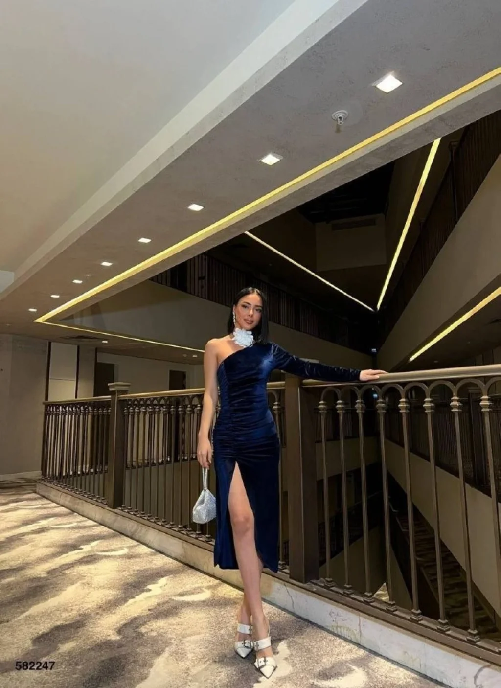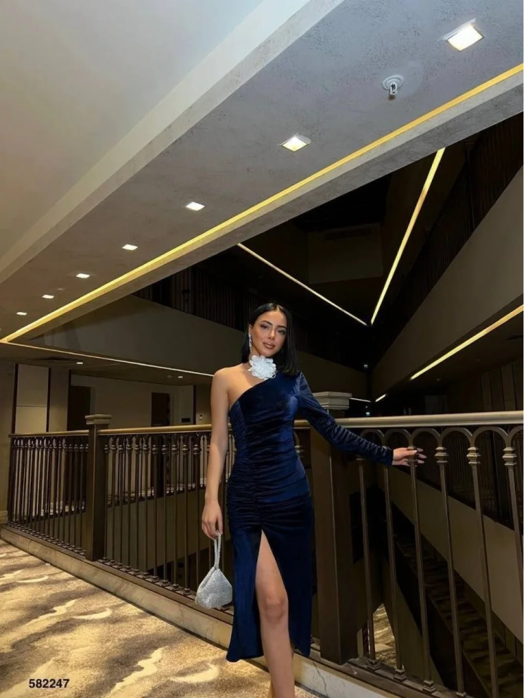 Kadın Uzun Kollu Omuz Dekolteli Büzgü Ve Asimetrik Yırtmaç Detay Elbise
