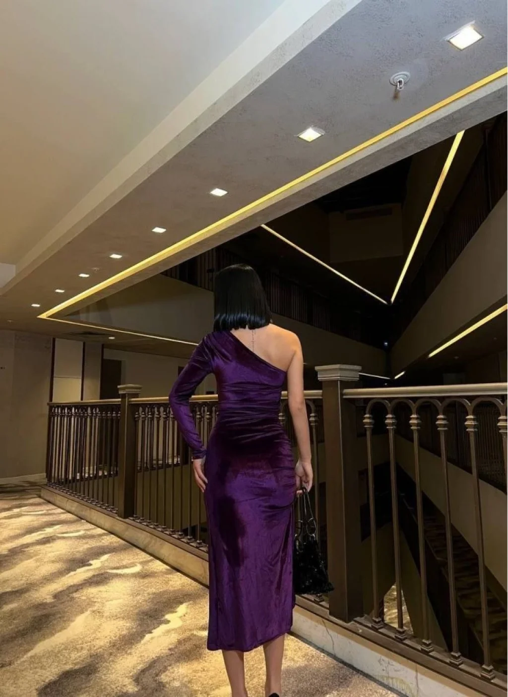 Kadın Uzun Kollu Omuz Dekolteli Büzgü Ve Asimetrik Yırtmaç Detay Elbise