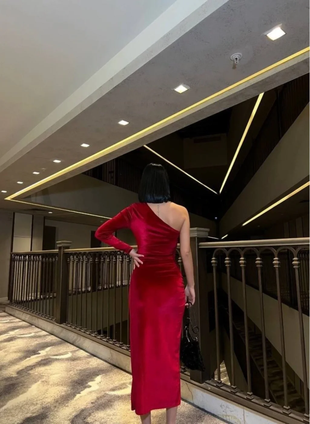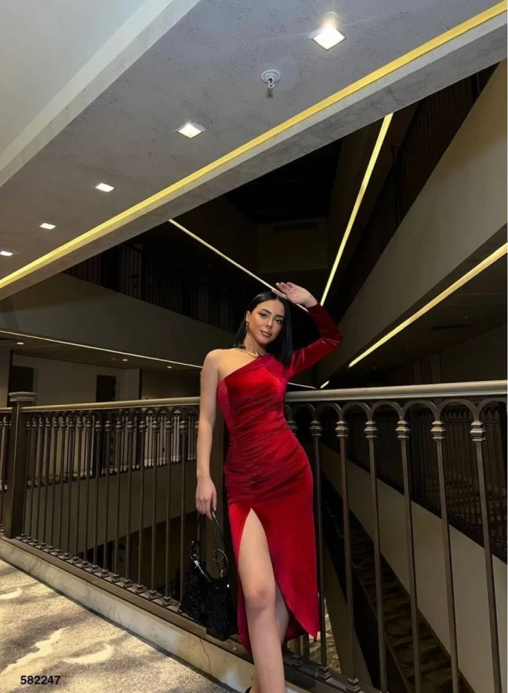 Kadın Uzun Kollu Omuz Dekolteli Büzgü Ve Asimetrik Yırtmaç Detay Elbise