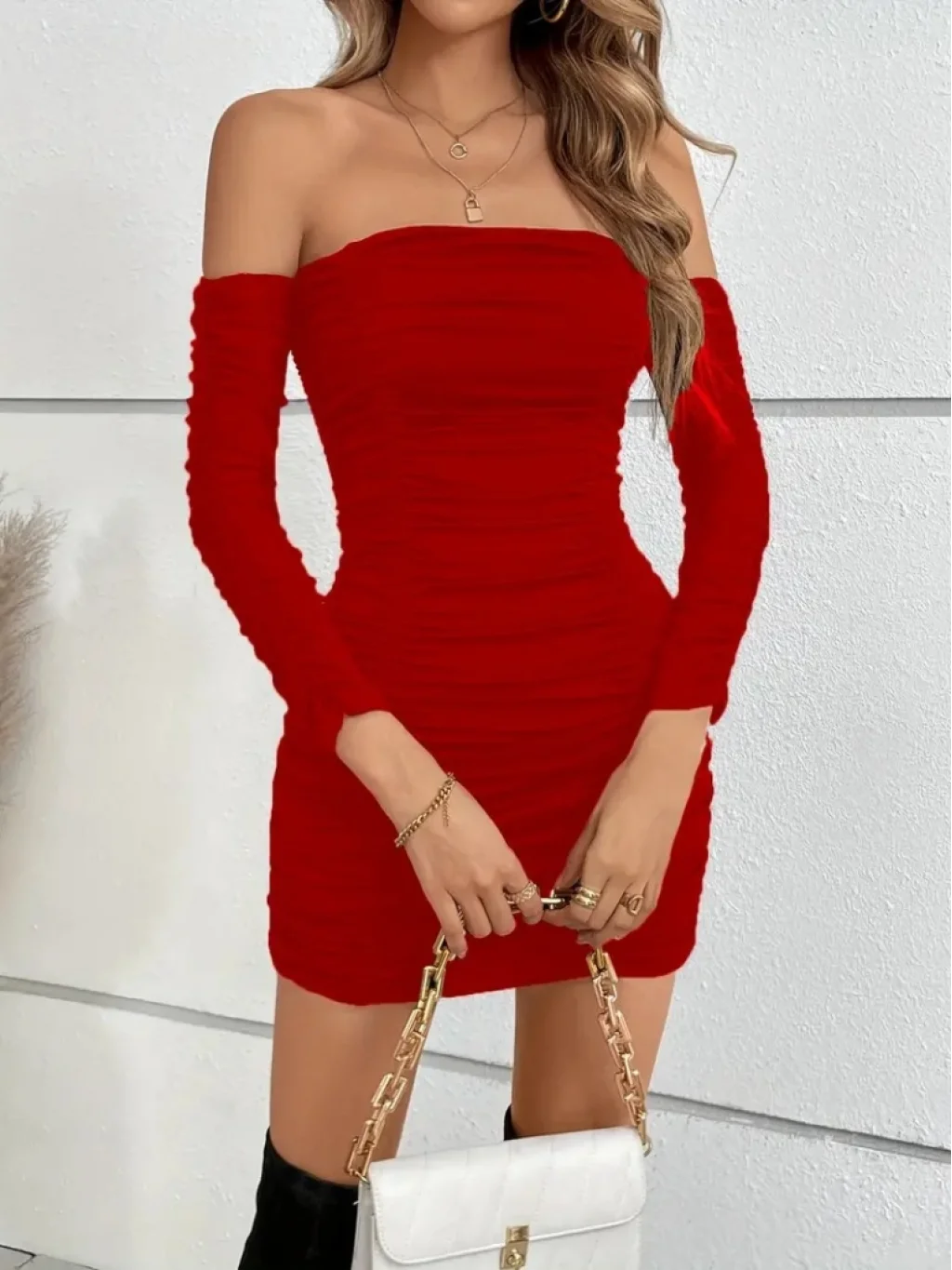 Kadın Uzun Kollu Omuzlardan Açık Takma Kollu Büzgülü Sandy Kısa Elbise