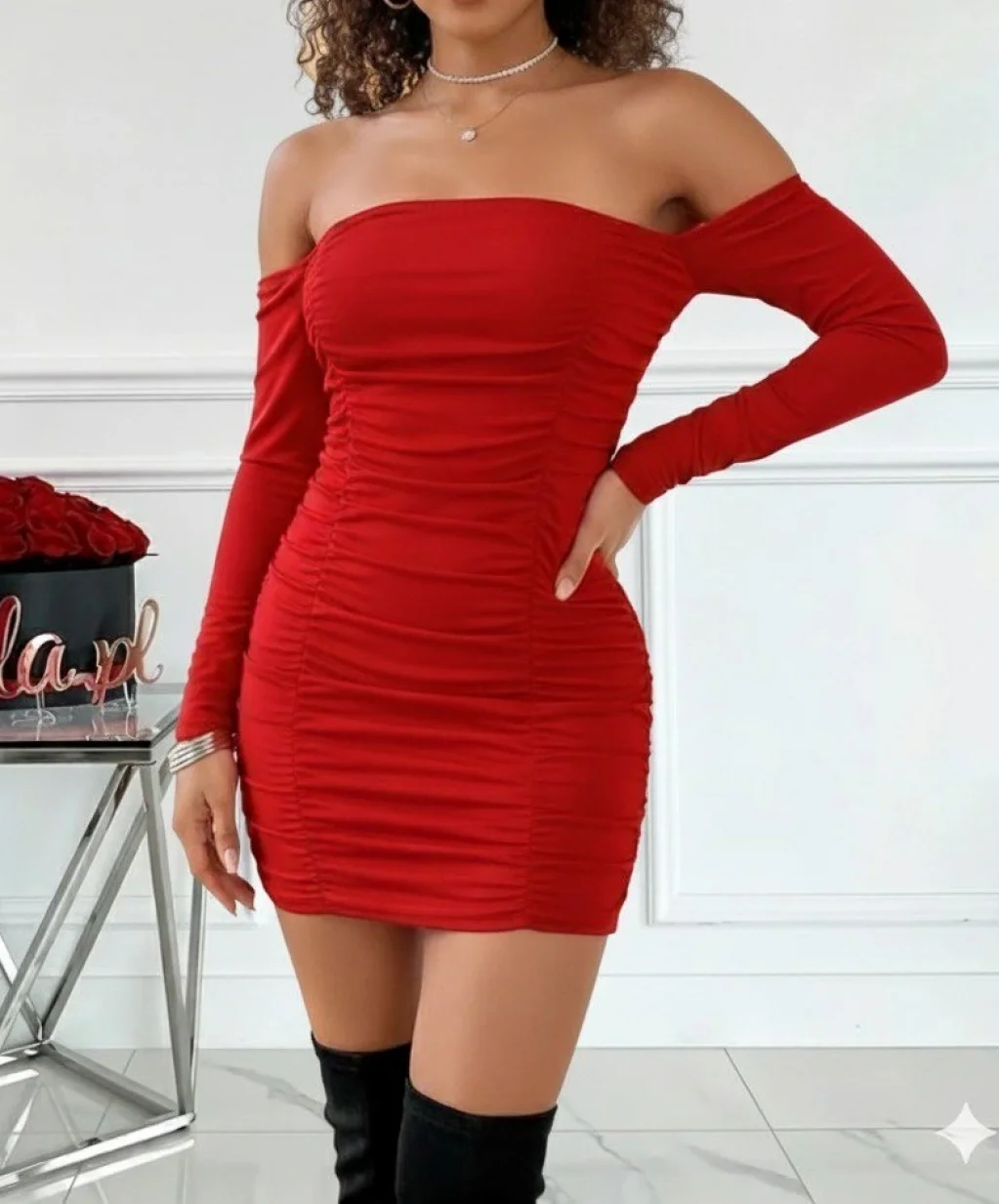 Kadın Uzun Kollu Omuzlardan Açık Takma Kollu Büzgülü Sandy Kısa Elbise