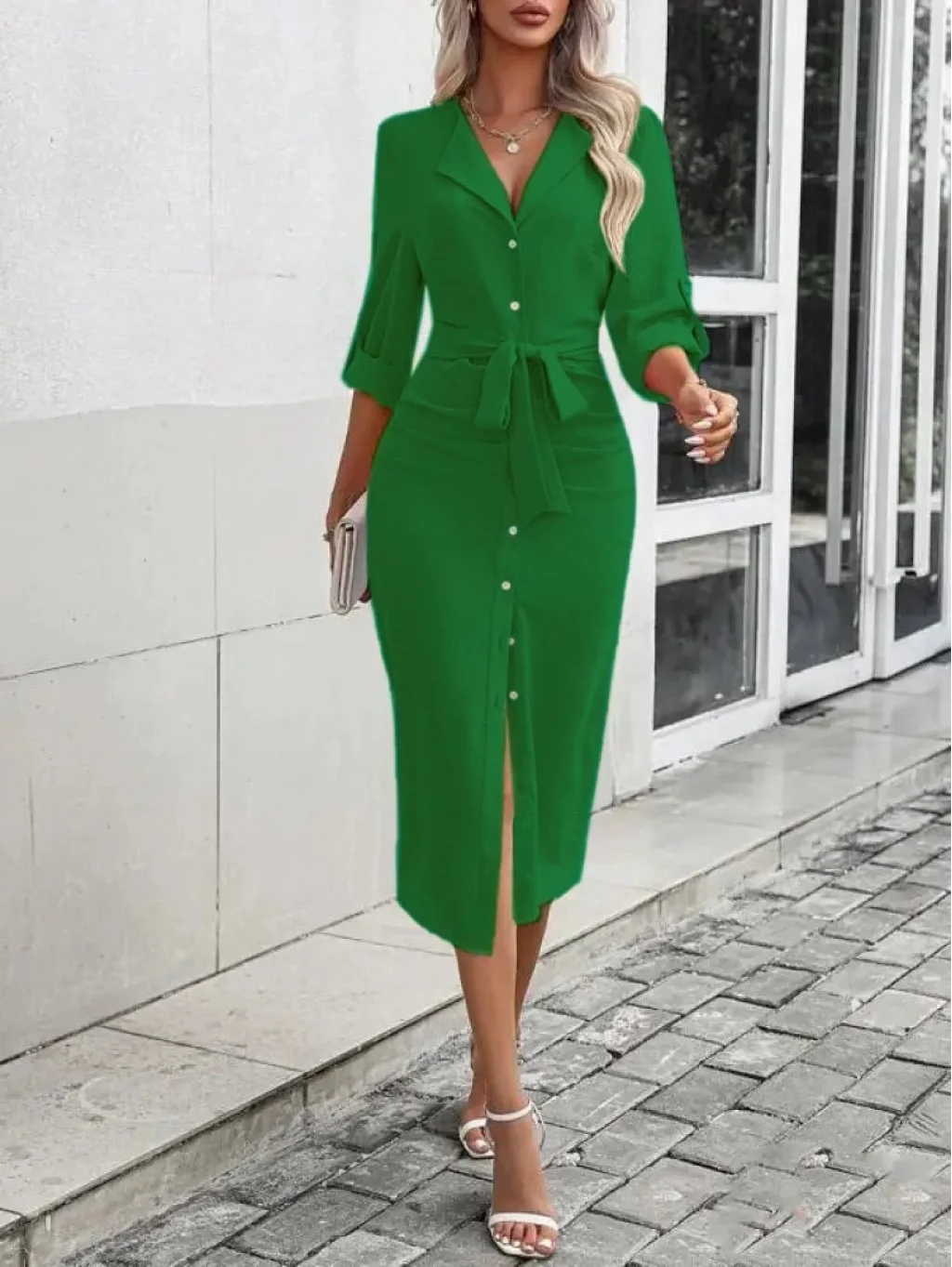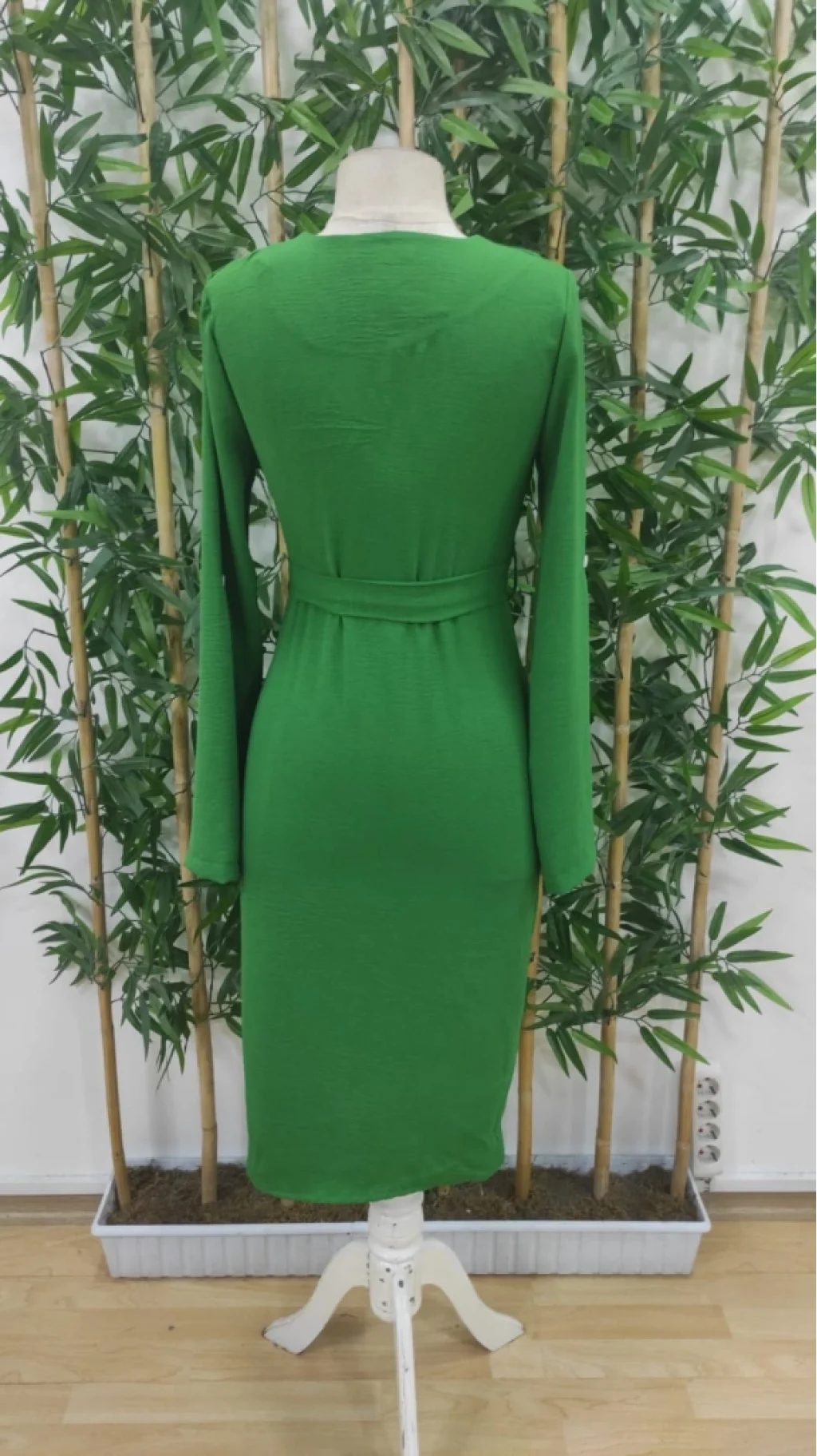 Kadın Uzun Kollu önden Düğmeli Beli Kuşaklı Aerobin Midi Elbise