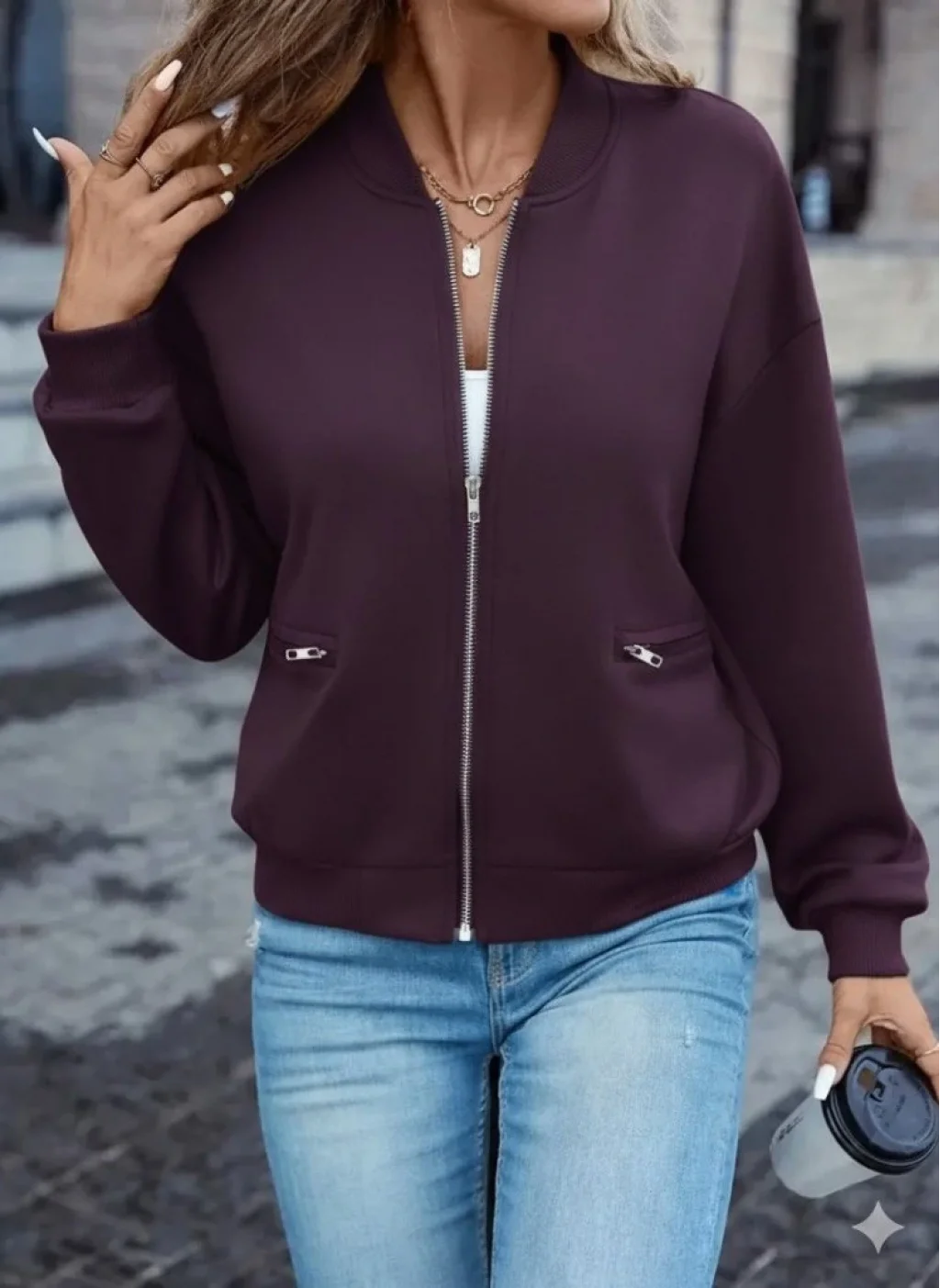 Kadın Uzun Kollu önden Fermuarlı Cepli Modal Mürdüm Ceket