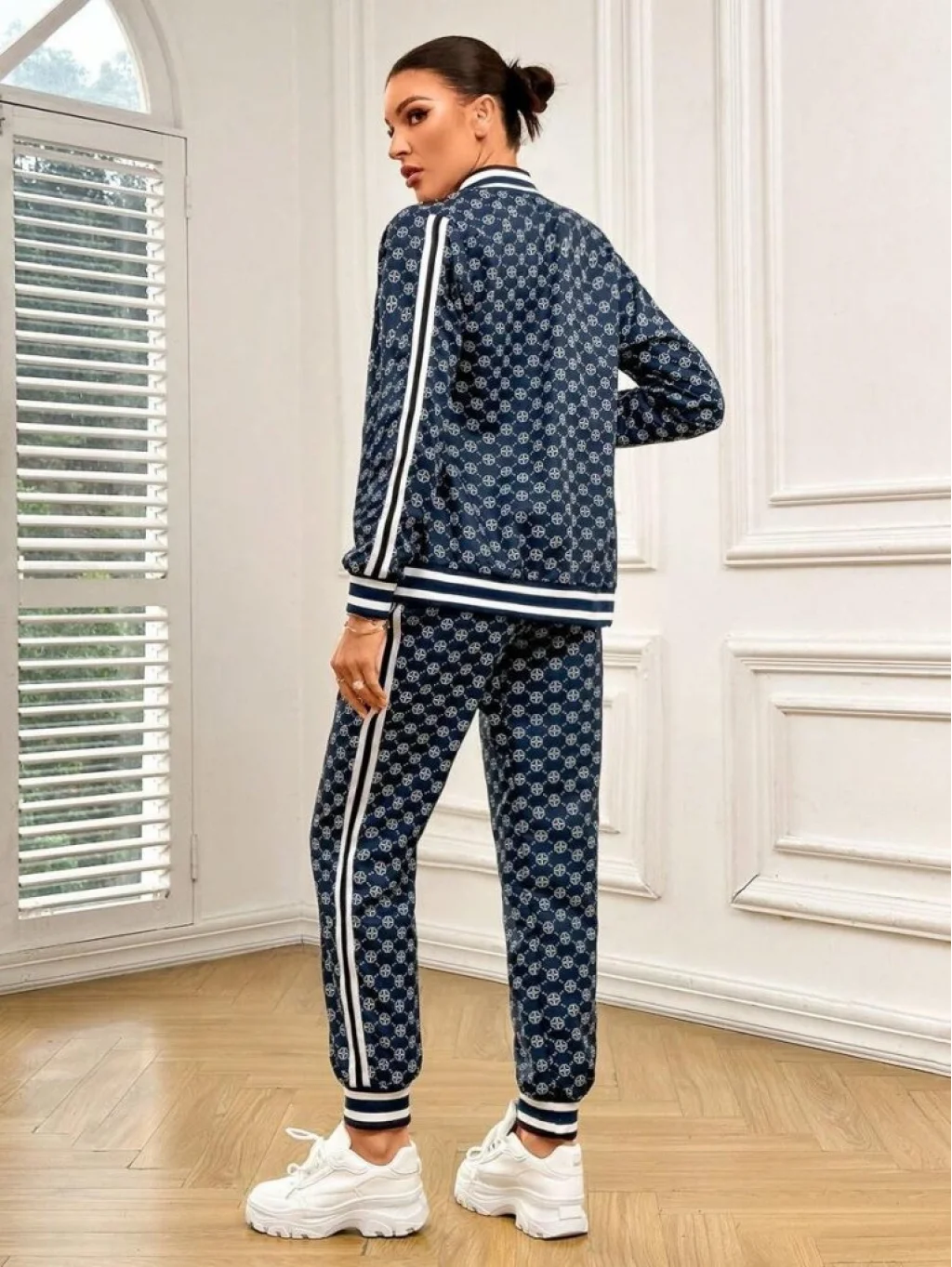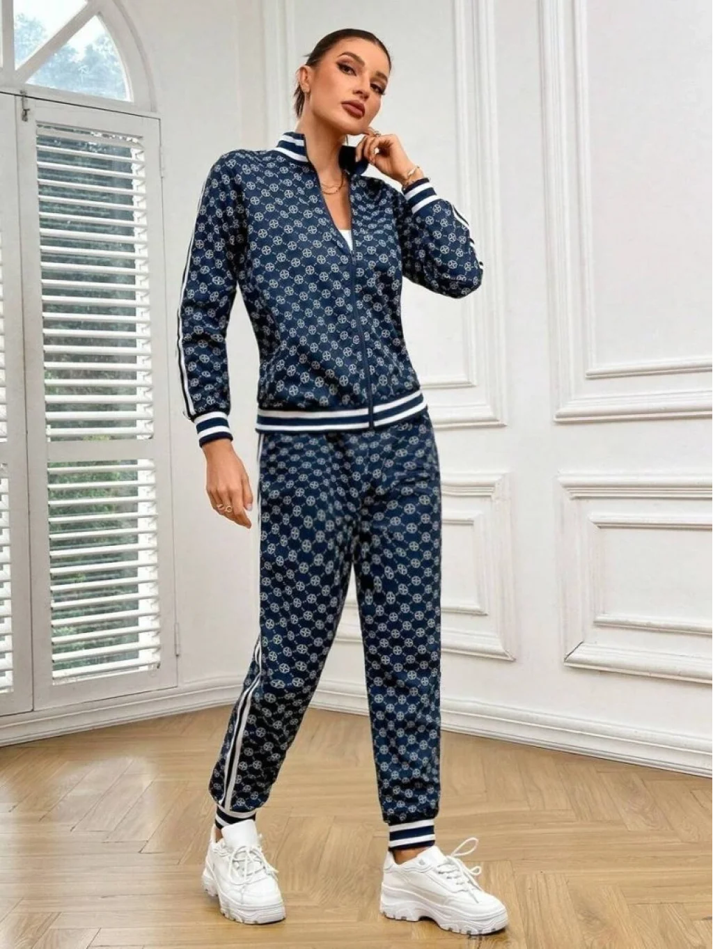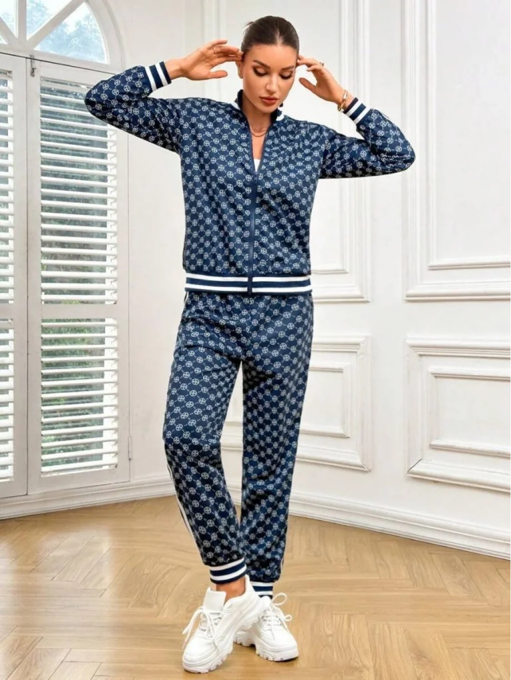Kadın Uzun Kollu önden Fermuarlı Desenli Iki Iplik Bluz Ve Pantolon Ikili Takım