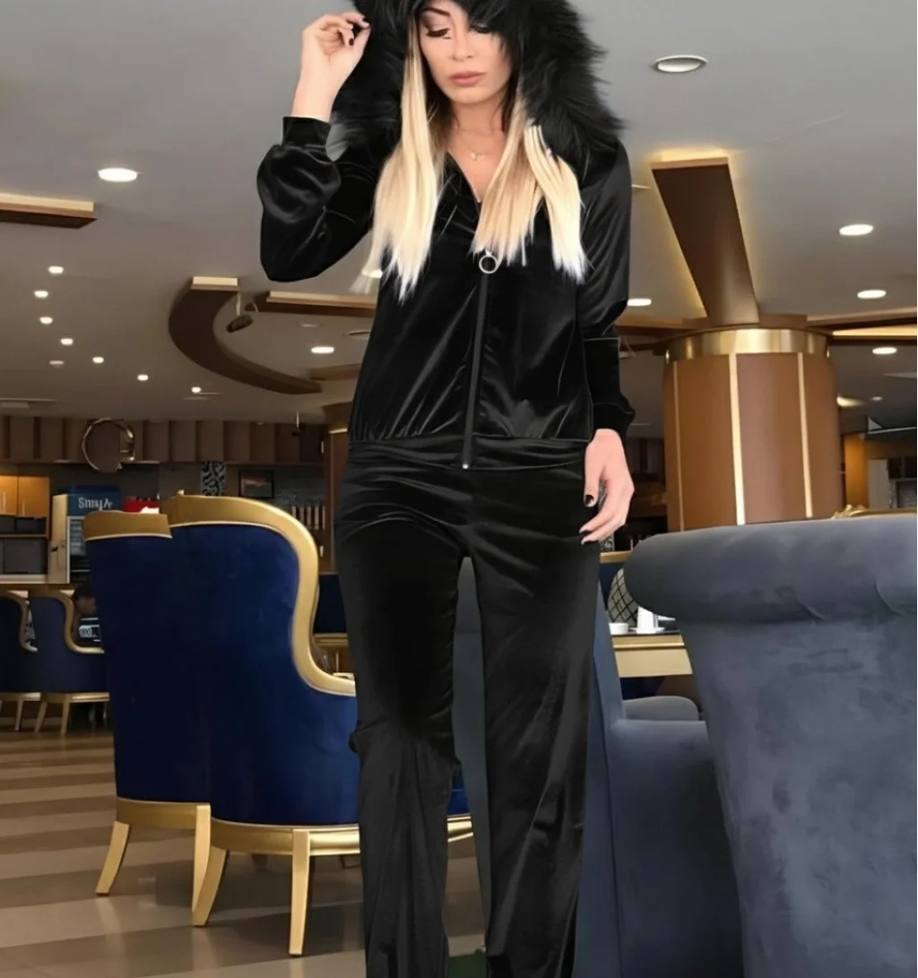 Kadın Uzun Kollu önden Fermuarlı Kapşon Tüy Detaylı Kadife Bluz Ve Pantolon Ikili Takım