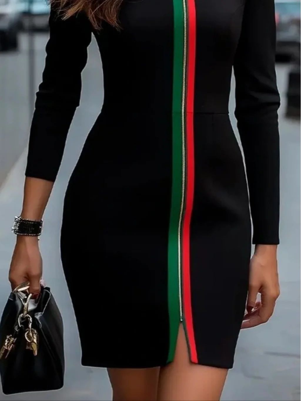 Kadın Uzun Kollu önden Tam Boy Fermuarlı Renkli şerit Detaylı Viskon Iki Iplik Mini Elbise