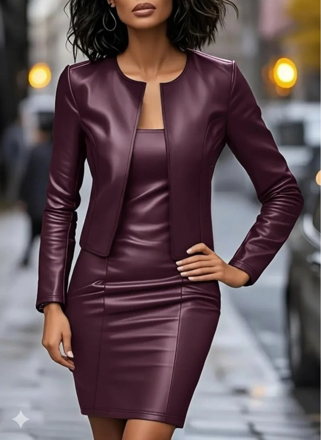 Kadın Uzun Kollu önü Açık Deri Ceket Ve Askılı Yuvarlak Yakalı Mini Elbise Ikili Takım